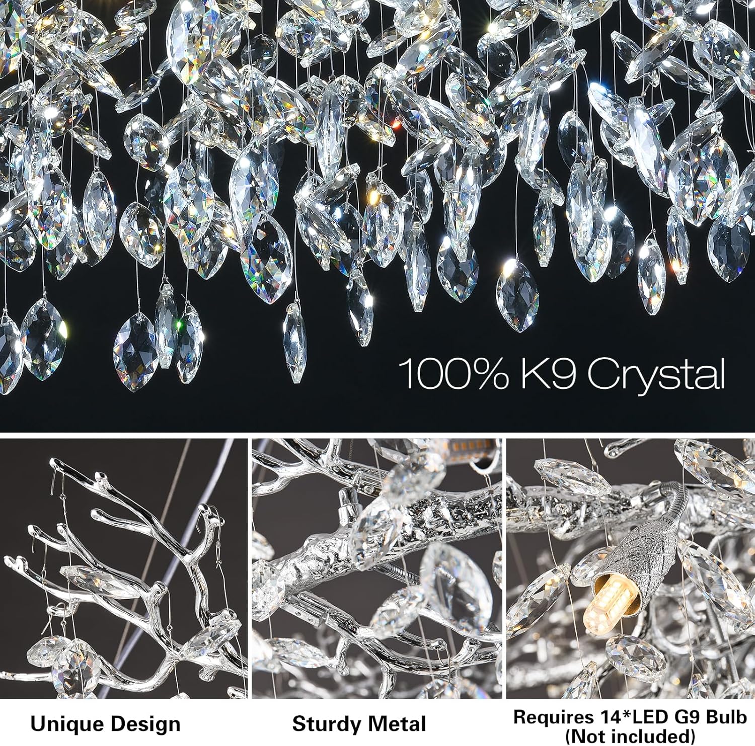 - Light Source:This Round Branch Crystal Chandelier Does Not Include Light Bulbs. It Requires 14 X G9 Bulbs. You Can Choose Bulbs With Different Color Temperatures Depending On Your House DéCor, We Generally Recommend Using 3000k Warm White Light Bulbs. The Chandelier Is Dimmable Using Dimmable Bulbs And A Compatible Dimmer Switch.