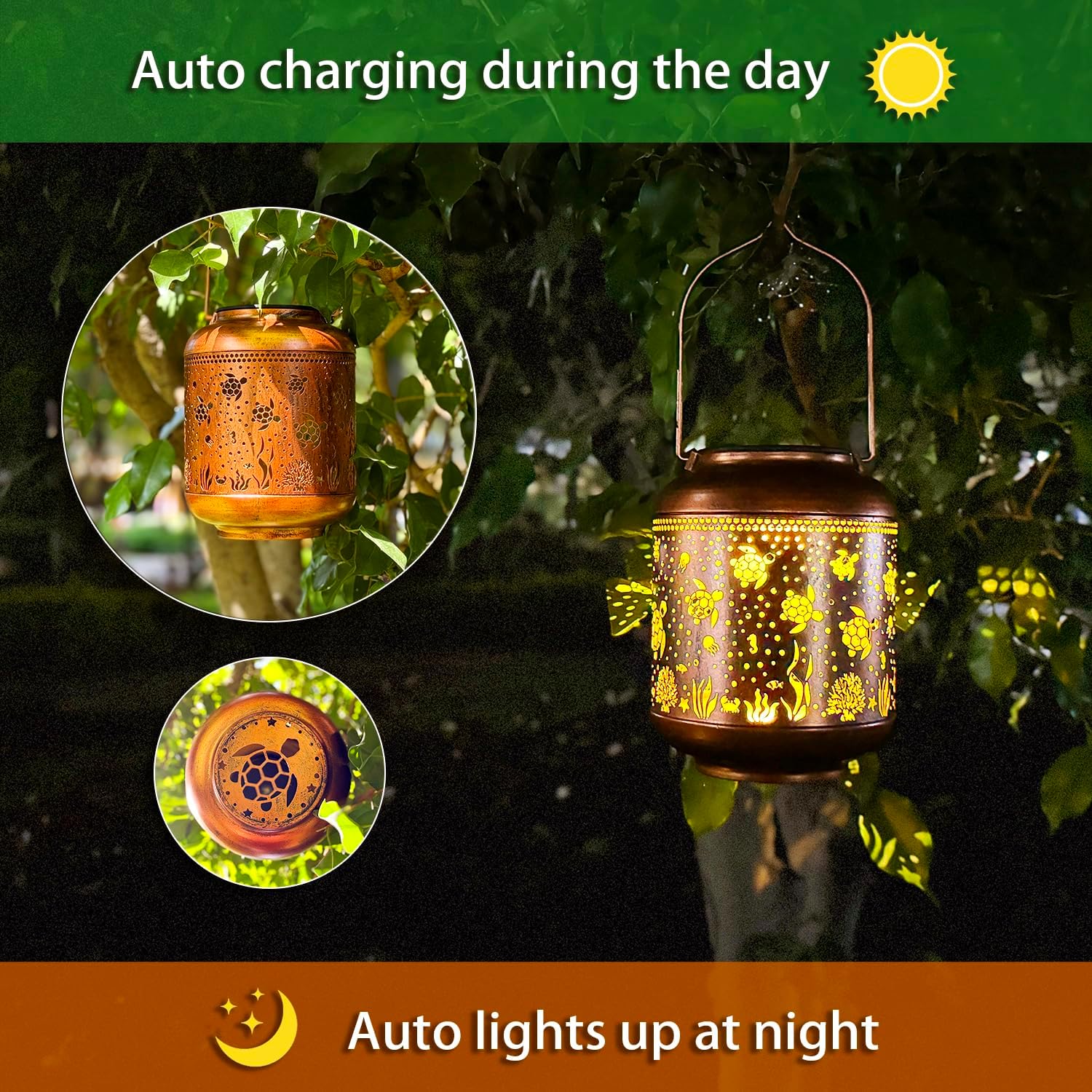 - 【Efficient Solar Powered】Before using,please press the button to put it in the "on" position.The Sea Turtle solar outdoor lantern will absorb sunlight to charge for about 6 hours during the day and will light up for about 8 hours at night.It automatically turns on at dusk and off at dawn,making it super easy to use.Size:6.8"H x 4.7"W x 4.7"L