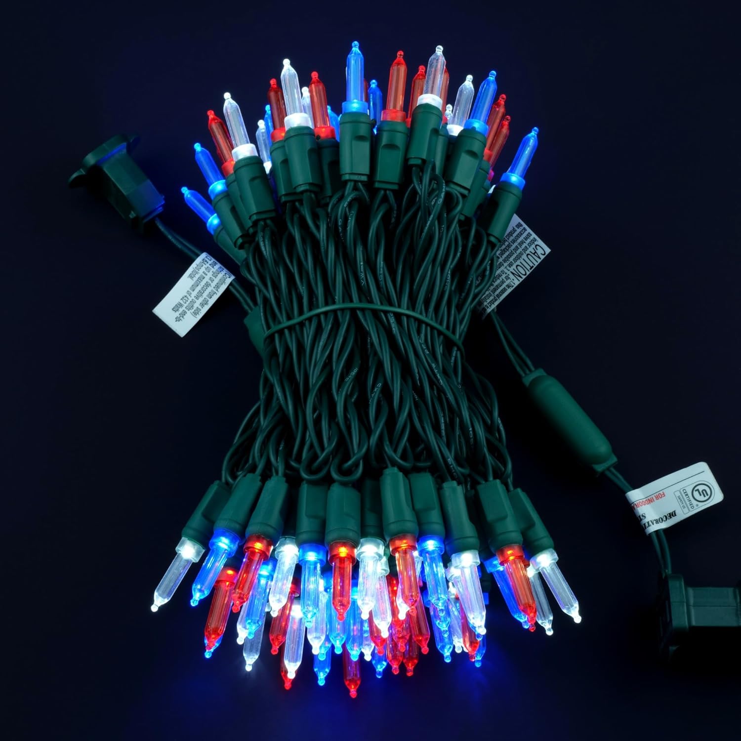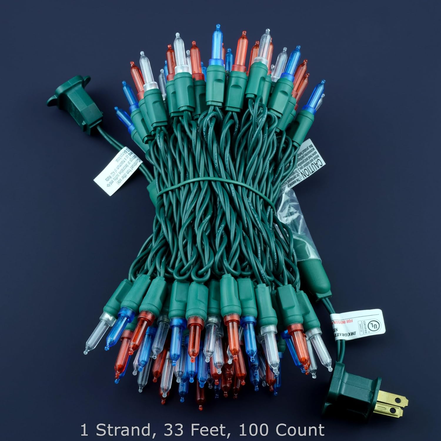- SPECIFICATIONS โ Each pack contains 1 strands of one-piece string lights, total length 33 feet with 100 count multicolor mini lights. Three colors of light bulbs are spaced out, they are red, white, and blue. 22 AWG green cord, 4" lead, 4" spacing, 4" tail.