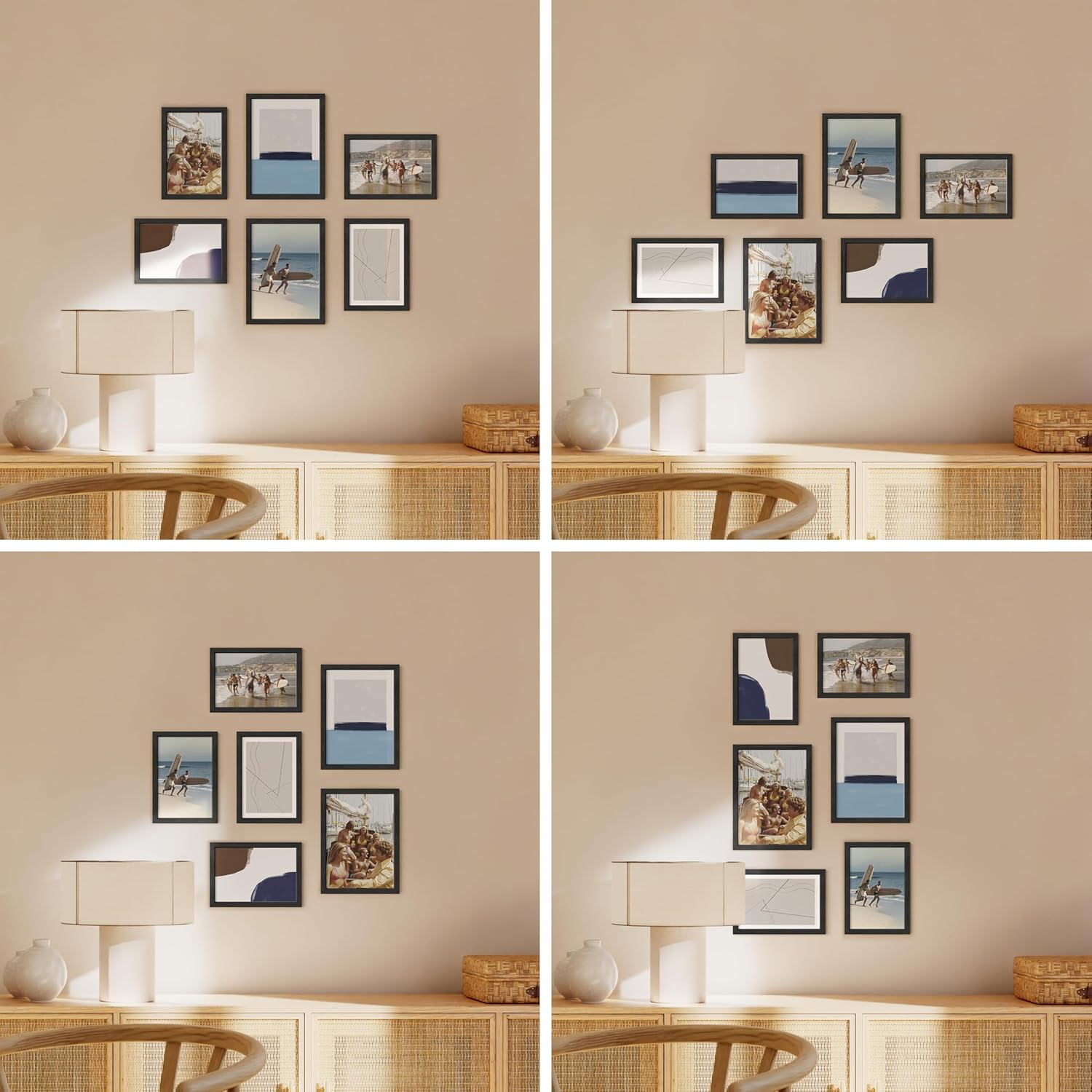 - PREMIUM WALL ART: Our black gallery wall frame set will add the finishing touch to your art or photograph. They're equipped with plexiglass covered by protective film and two metal hangers for horizontal or vertical hanging. For added convenience, our black collage picture frames is shipped in a durable box, securing their protection throughout transit