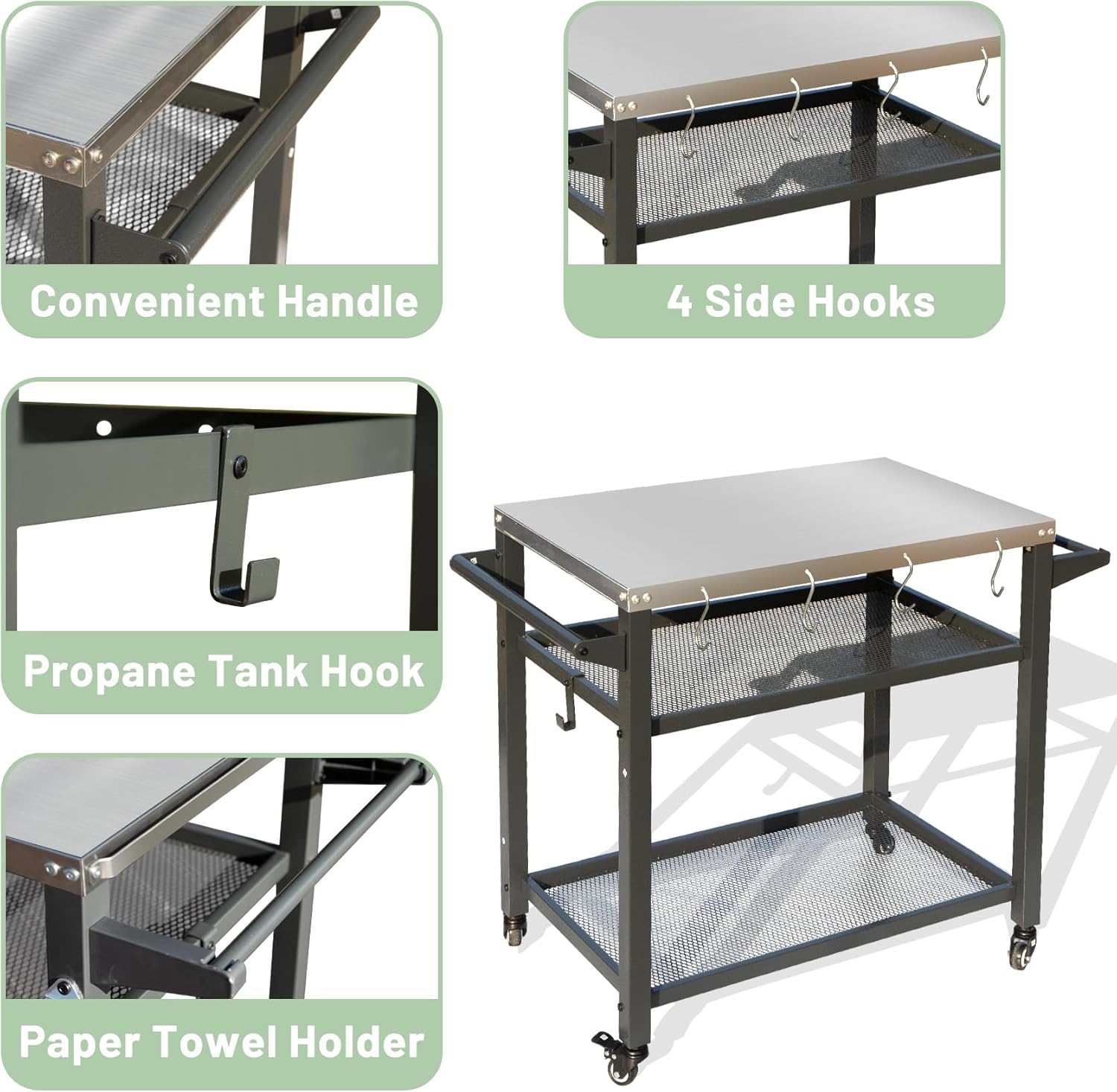 - Full & Useful Accessories- The food prep cart table includes paper towel holder, paper tissue holder, propane tank hook, bottle opener, 8 multi-functional tool hooks, etc, organizing all your favourite utensils for different cooking propose.