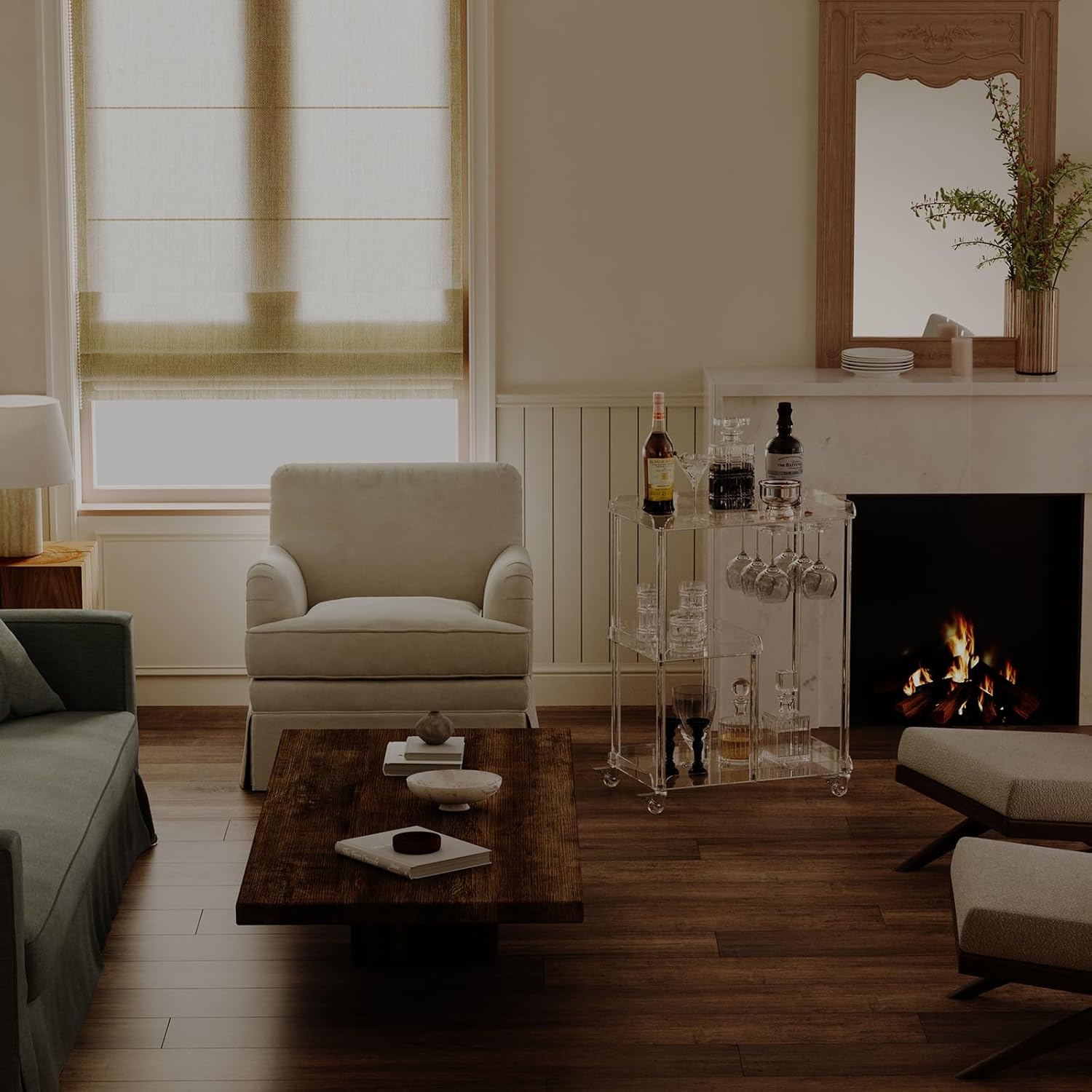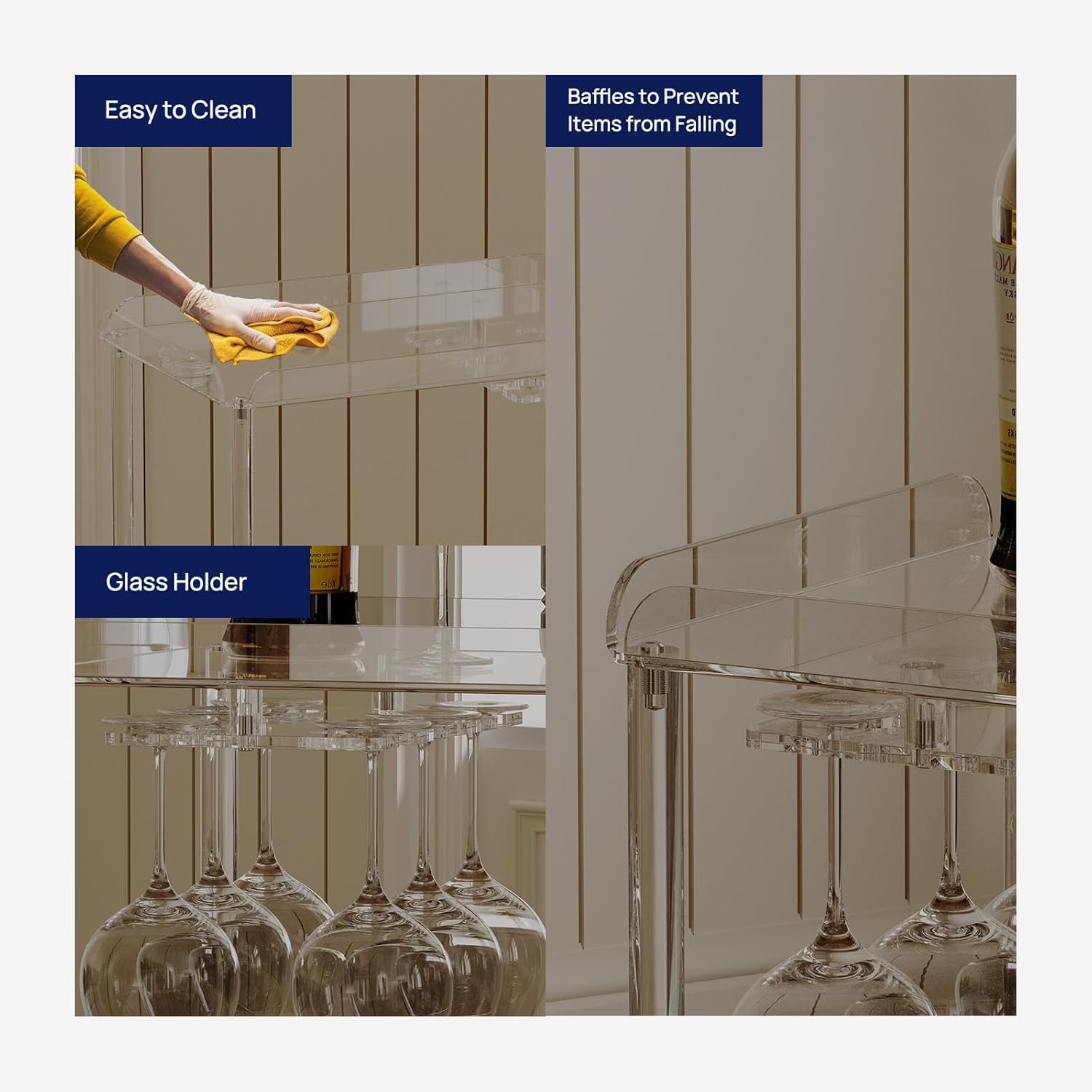 - Modern Bar Cart: Clear acrylic bar cart with 6 glass holders, modern and sophisticated. Fashional staggered layout design, suitable for various decoration styles and different cccasions.