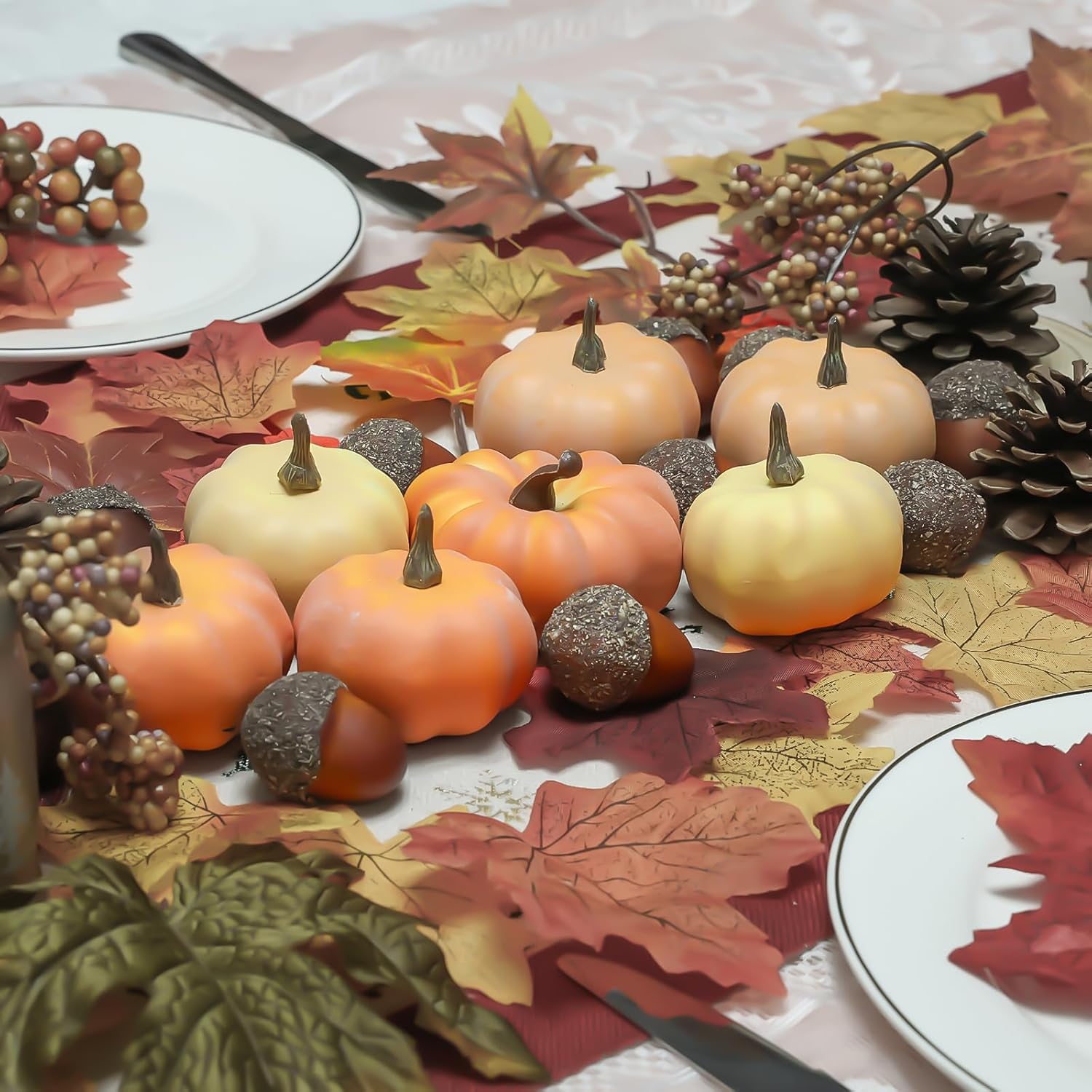 - 【Fall Decorations for Home】 - This fake pumpkins for decorating set includes 21 pcs ( 7 pcs lifelike artificial pumpkins, 10 pcs realistic acorns, 4 pcs realistic fall maple leaves ), artificial vegatables small pumpkins, and the beautiful Fall decor colors is very suitable for Harvest and Thanksgiving decor theme, especially thanksgiving table decor, fall party decorations, creating full fall sense for home decor