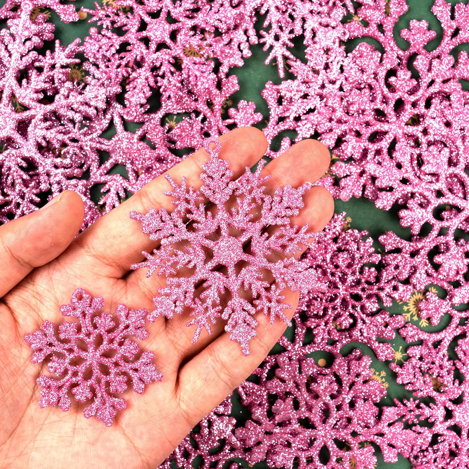 - SNOWFLAKES OF VARIED SIZES: A value pack of 36pcs light pink Christmas glitter snowflakes in 4 varied sizes and 2 different patterns: 8pcs for 4.2 inch for both styles, 10pcs for 3 inch and 10pcs for 1.8 inch. Itโs a lot of snowflakes sufficient for your Christmas decorations.
