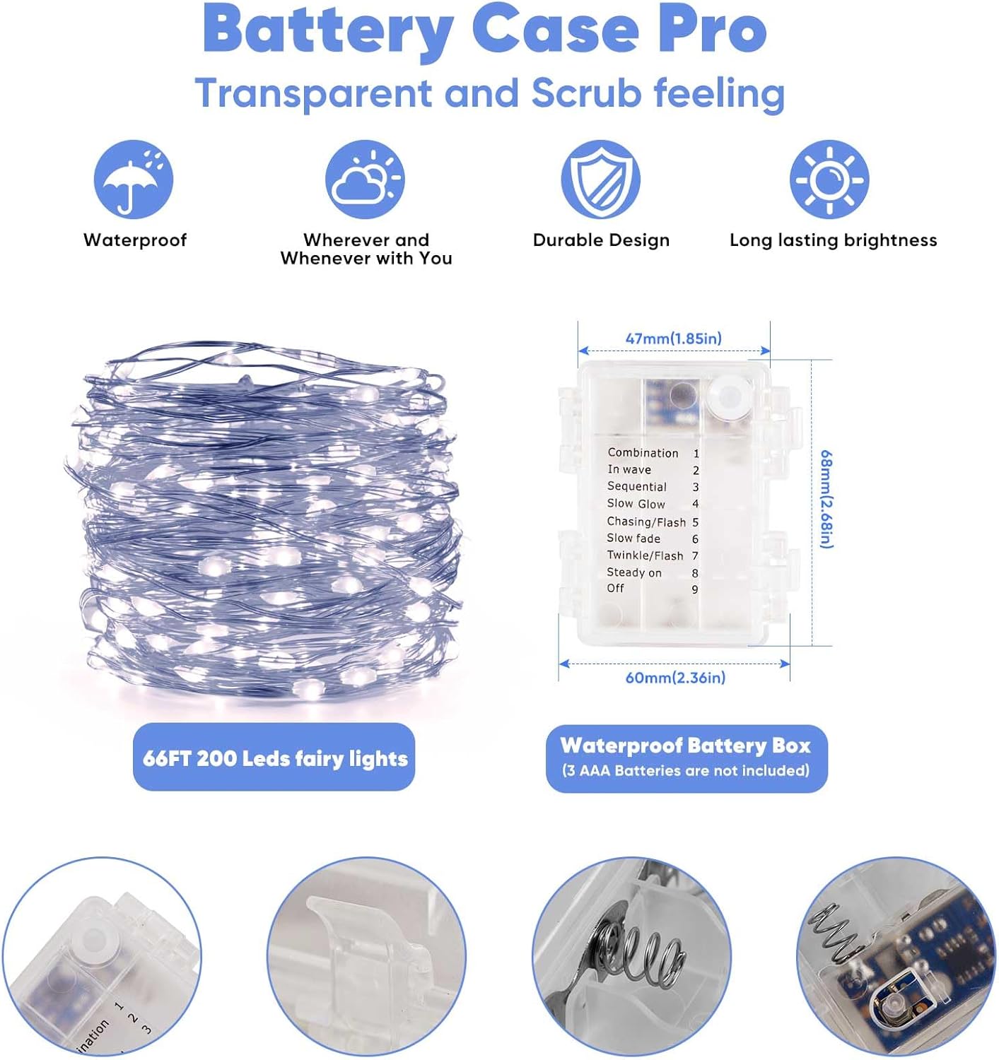 1 Pack 65.6 Ft. Battery Operated Outdoor String Lights with Remote & Timer, LED Cool White Fairy Lights, Waterproof Twinkle Lights for Bedroom, Dorm, Mason Jar, Wedding, Party, Christmas