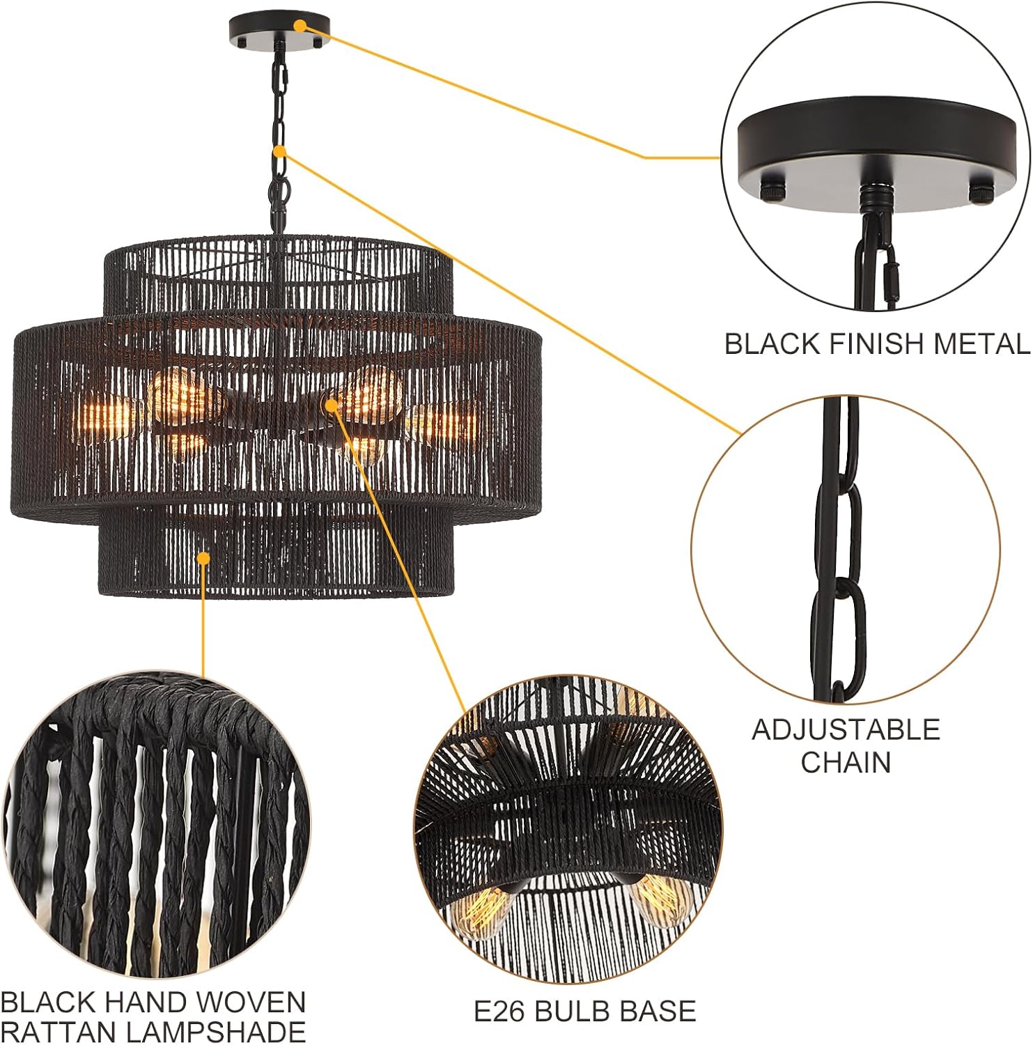 Hand-Woven Rattan Chandelier Vintage 6-Light Farmhouse Boho Bamboo Chandeliers Light Fixture 23.6" Retro 3-Tier Drum Wicker Rattan Black Chandelier for Dining Room, Kitchen Island, Bedroom
