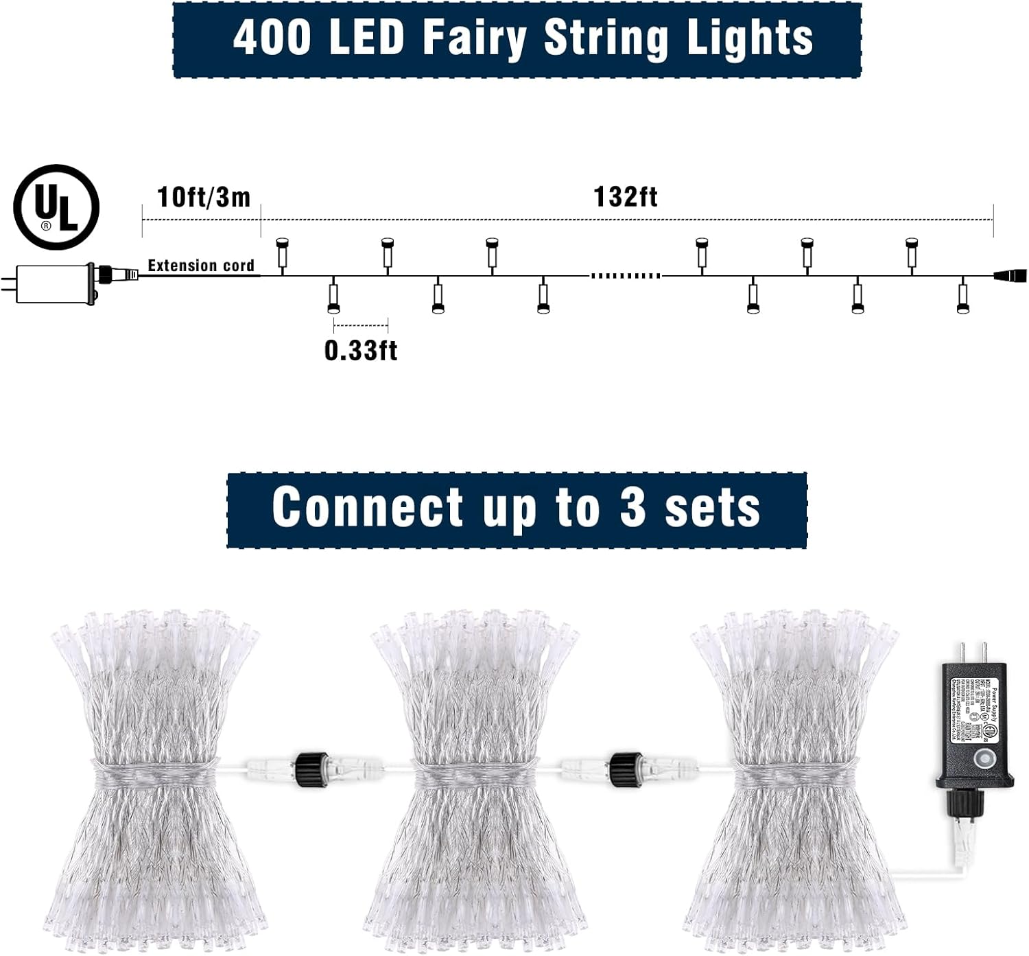 - Warm White String Lights Indoor: 400 LED string lights total length is 142 ft, including 132 ft Christmas lights and a 10 ft extension cord. End-to-end connectable Christmas string lights can connect up to 3 strings for your decorative needs. The connecting string lights can be controlled by one controller.