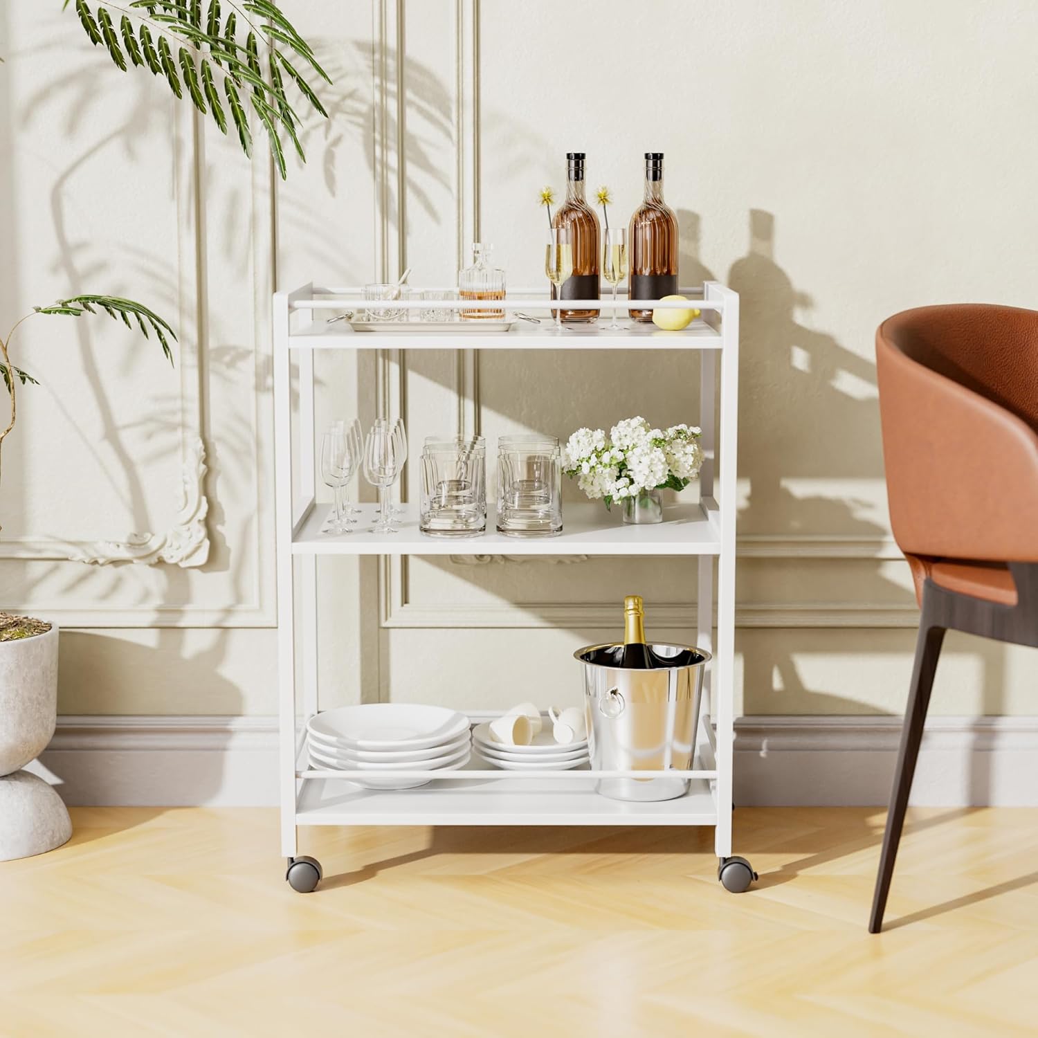 HITNET White Bar Cart, Home Bar Serving Cart, Kitchen Trolley on Wheels with Storage, 3 Tier Rolling Beverage Cart for Living Room Kitchen Home Office