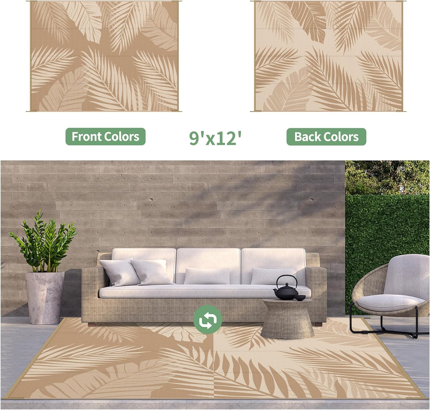 - Palm Leaf Design & Double-Sided Pattern: GENIMO reversible fall outdoor rug is designed with a double-sided pattern, completing the unique layout of multiple palm leaves. The 2 shades of brown and beige achieve the ultimate fusion. Either side can blend perfectly with nature and look very full and comfortable, making it a versatile piece for fall decor