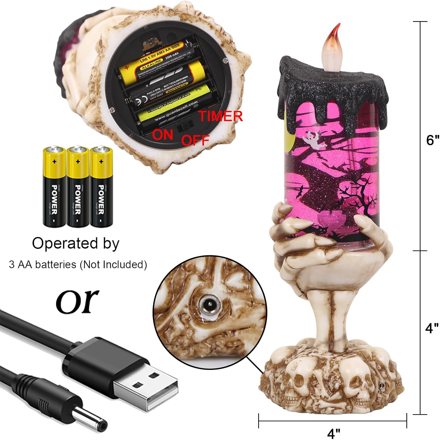 - [SNOW GLOBE CANDLES]: Vivid skeleton hand candle holder grab the lighted snow globe lamp, glittering ghosts and spinning water with yellow lights create a spooky horror atmosphere. Decorate your Halloween in a different way this year, water glittering spinning snow globe candle will light up your whole Halloween season