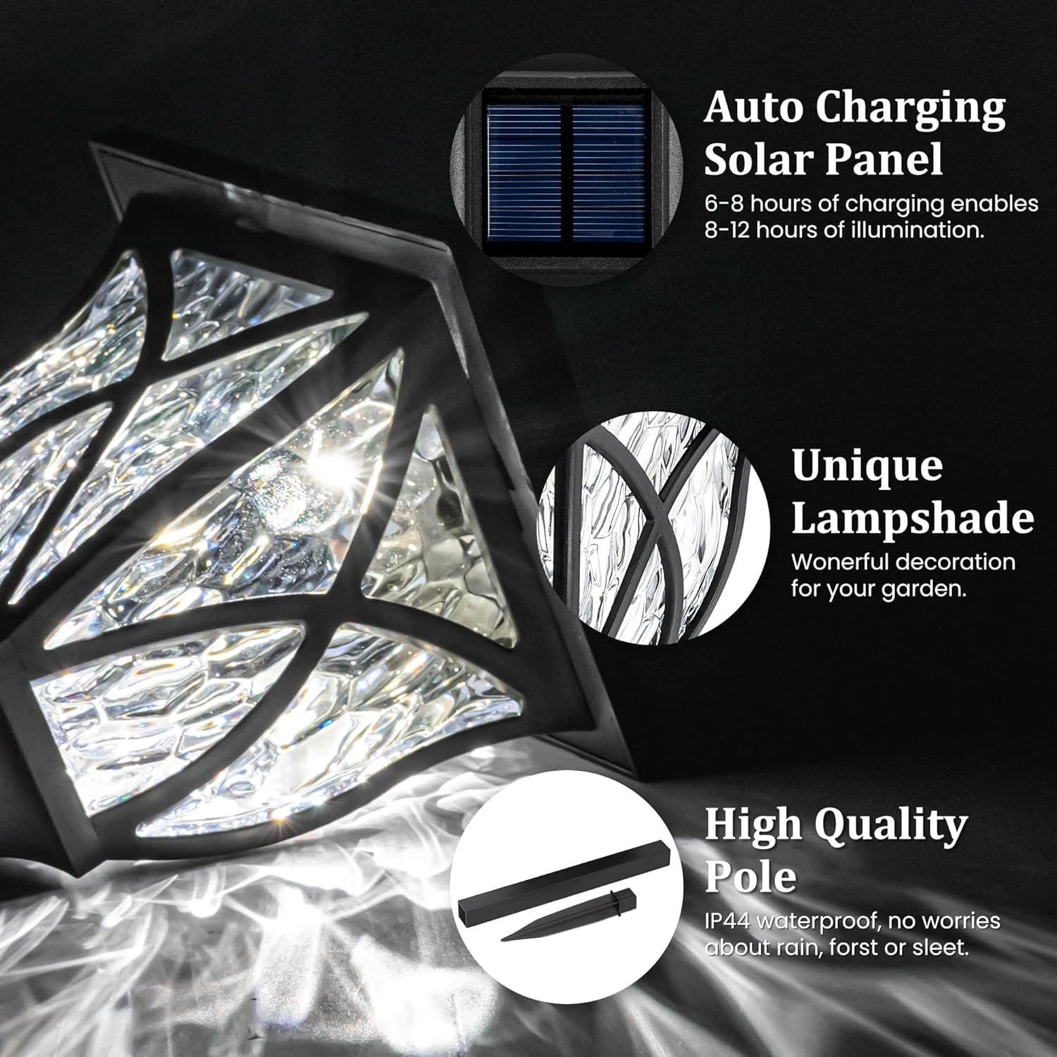 - 【Unique and Enchanting Design】Solar outdoor walkway lights are designed to provide an attractive pattern, also as a focal attractive in your planter for outdoor plants and lights up your garden at night. Enhance the beauty of your path, garden, patio, lawn, yard, walkway and planter with the distinctive water-ripple pattern of our solar pathway lights. Its enchanting touch will surely captivate anyone who sees it