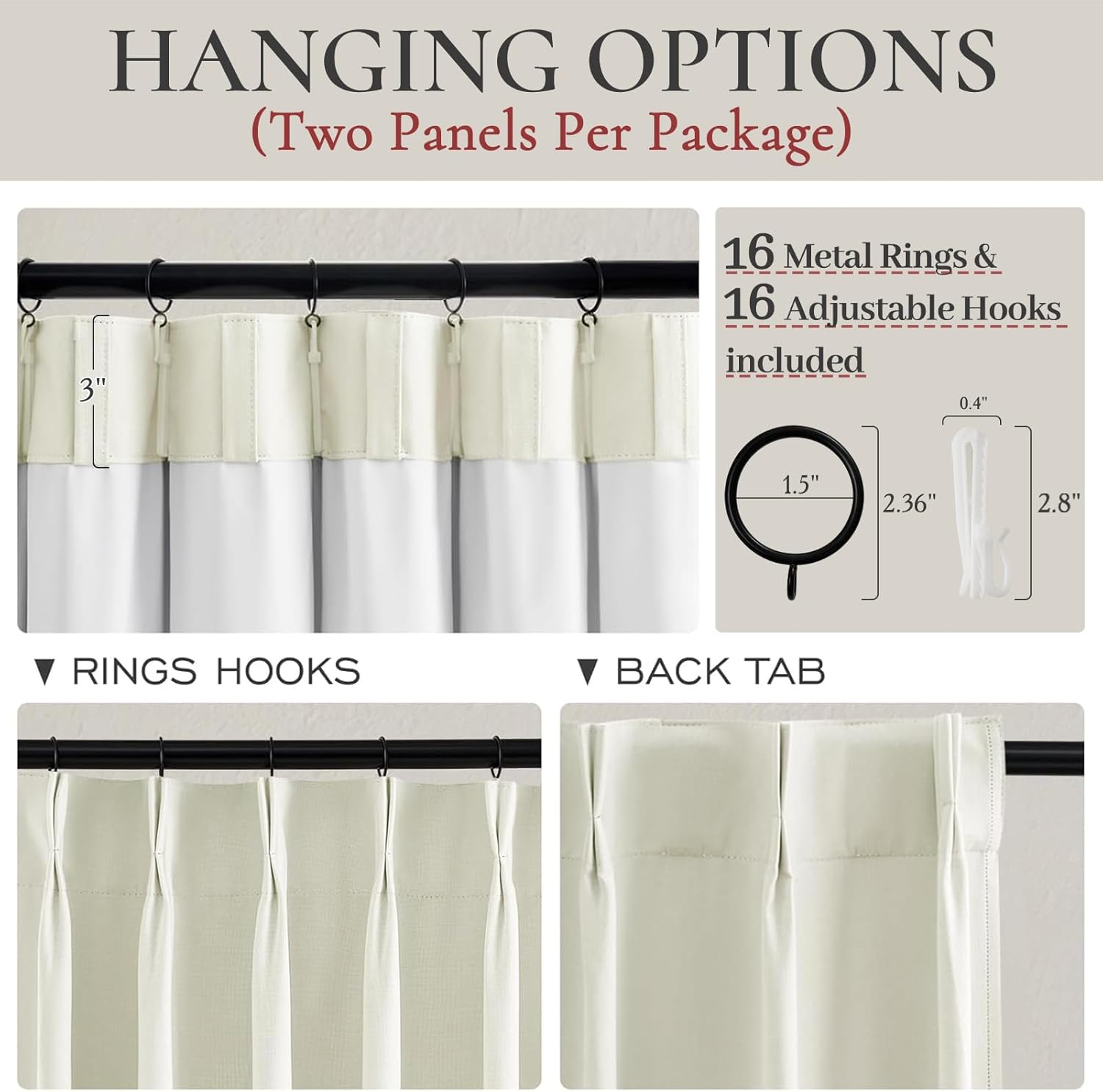 - Ready Made:Set of 2 pinch pleated curtain panels per package with 16 metal rings and 16 adjustable plastic hooks(The adjustable hook can raise and lower the height of the curtain by 1 inch),Each panel measures 40"W x 96"L,pair measures 80"W x 96"L