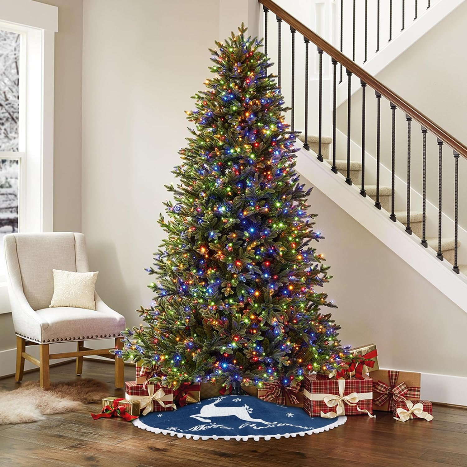 - Merry Christmas Tree Skirts:Our xmas tree skirt is printed with elk and various sizes of snow patterns, as well as the words "Merry Christmas." The edges are adorned with small, fluffy balls, adding a festive touch to your Christmas tree. This 36-inch tree skirt is perfectly sized for most Christmas trees perfectly. Before making a purchase, please measure the diameter of your tree to ensure a perfect fit