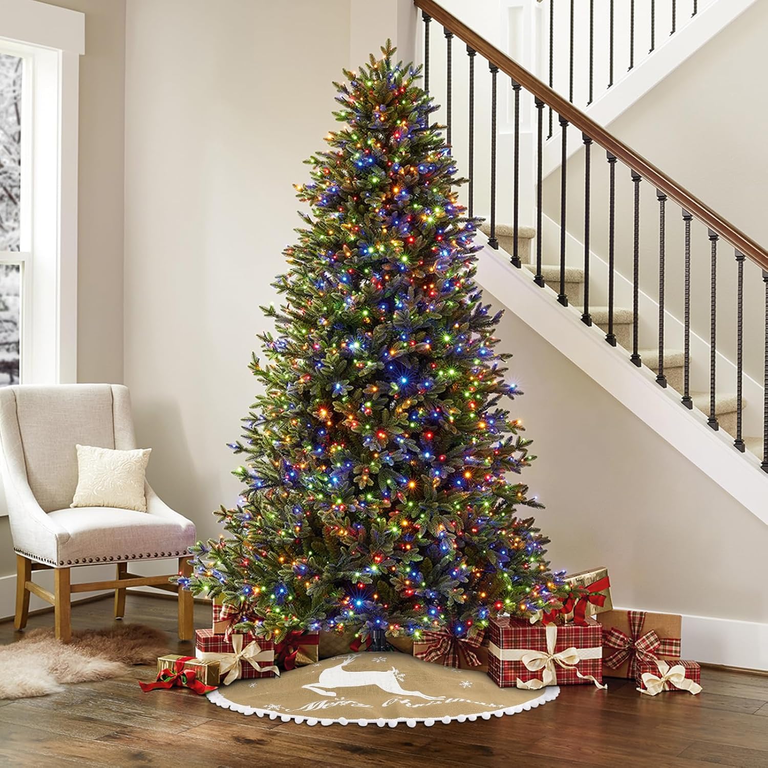 - Merry Christmas Tree Skirts:Our xmas tree skirt is printed with elk and various sizes of snow patterns, as well as the words "Merry Christmas." The edges are adorned with small, fluffy balls, adding a festive touch to your Christmas tree. This 36-inch tree skirt is perfectly sized for most Christmas trees perfectly. Before making a purchase, please measure the diameter of your tree to ensure a perfect fit