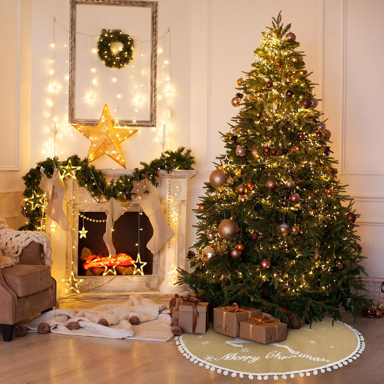 - Multi-Purpose Tree Skirt: You can place this linen color Christmas tree skirt anywhere, such as in your living room, bedroom, garden, office, bar, hotel, or supermarket for your Christmas tree decor. The burlap texture of the linen color tree skirt creates a rustic and cozy Christmas atmosphere