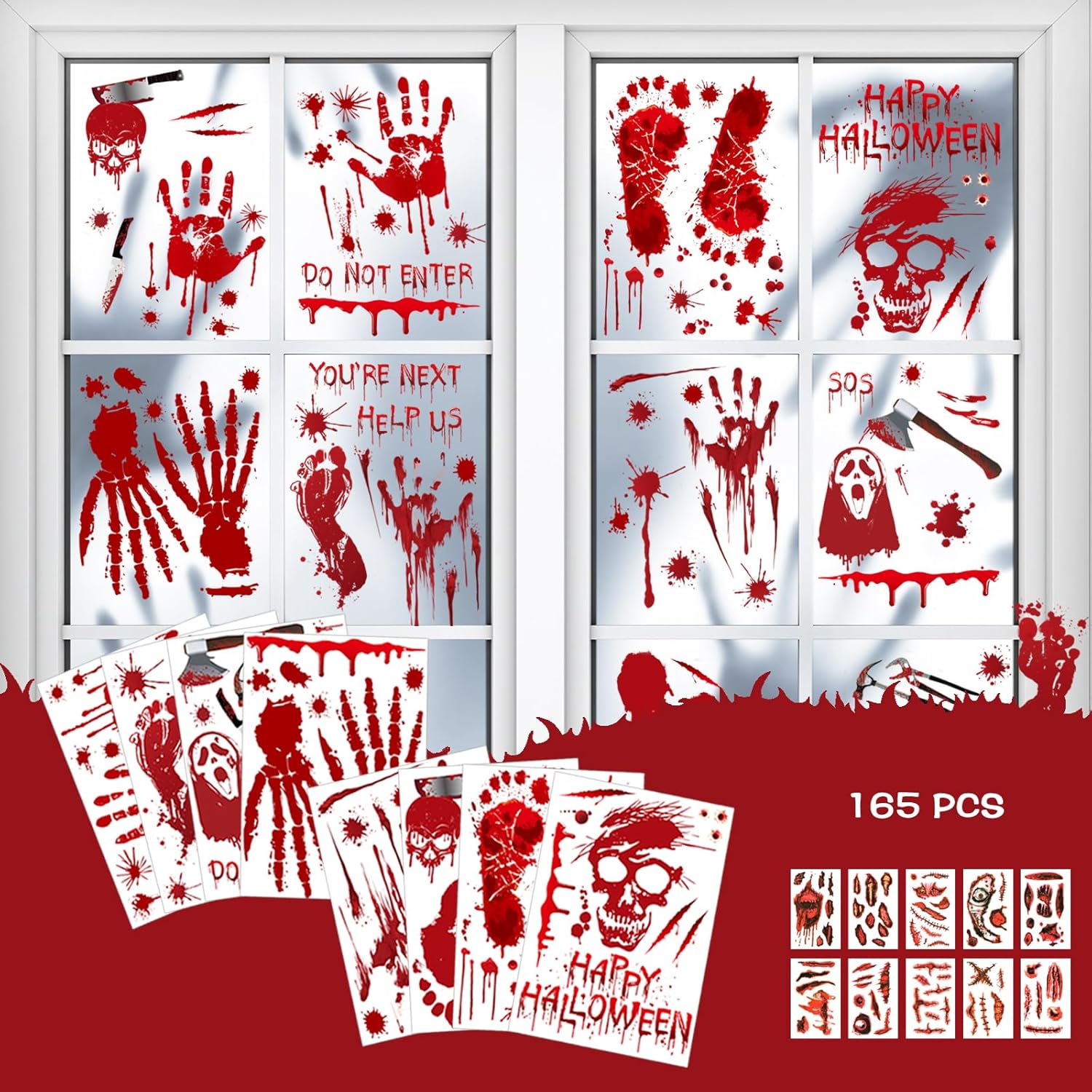 Halloween Decorations 165 PCS, 8 Sheets Bloody Handprint Footprint Halloween Wall Decal Floor Window Stickers,10 Sheets Wound Tattoo Stickers, Scary Party Decorations Window Stickers