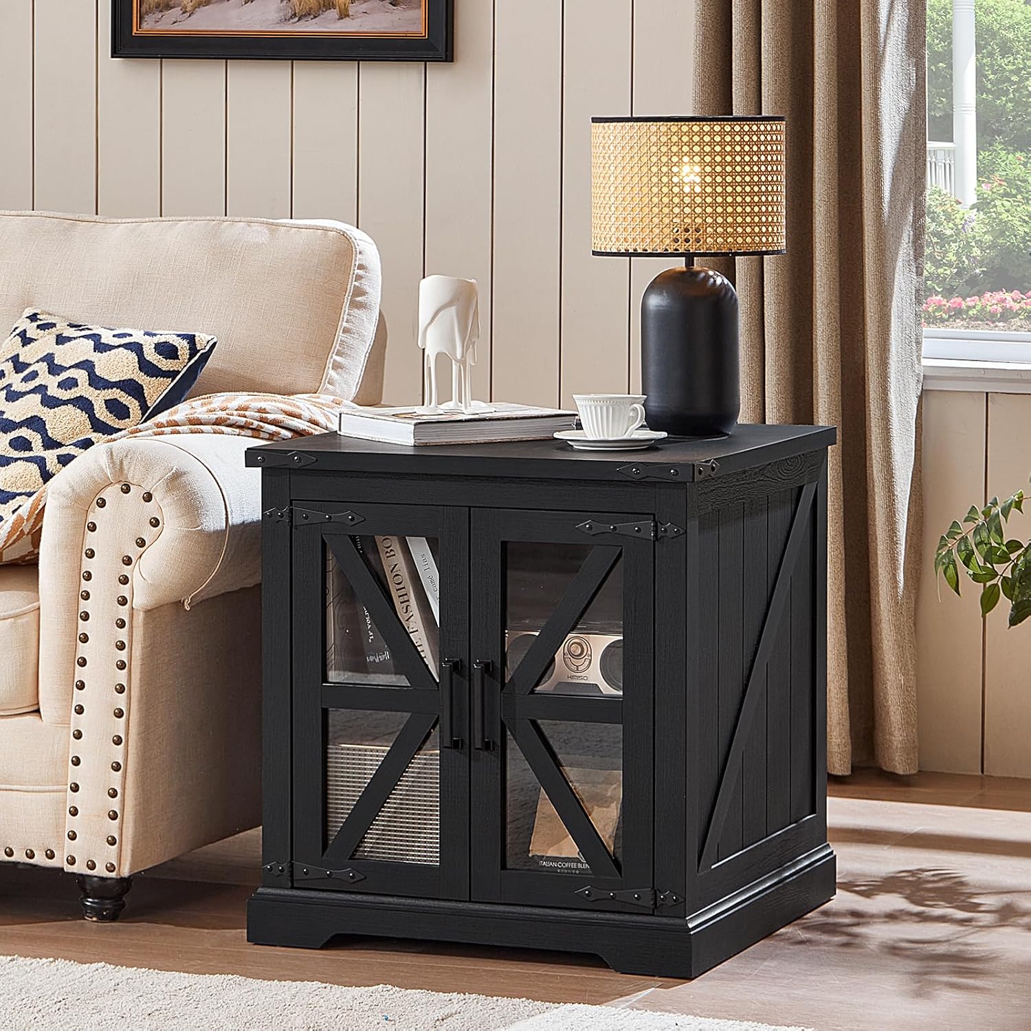 - ๐ก[Functional Art Piece]The oversized end tables living room storage design provides convenient storage for your living space. The built-in shelves can be adjusted to 3 different heights as per your needs, accommodating an abundance of books, blankets, or coffee mugs. The glass barn-style doors blend traditional farmhouse aesthetics with a modern sensibility, transforming this piece into a more contemporary farmhouse night stand, coffee table, bedside table, or side-of-sofa art.