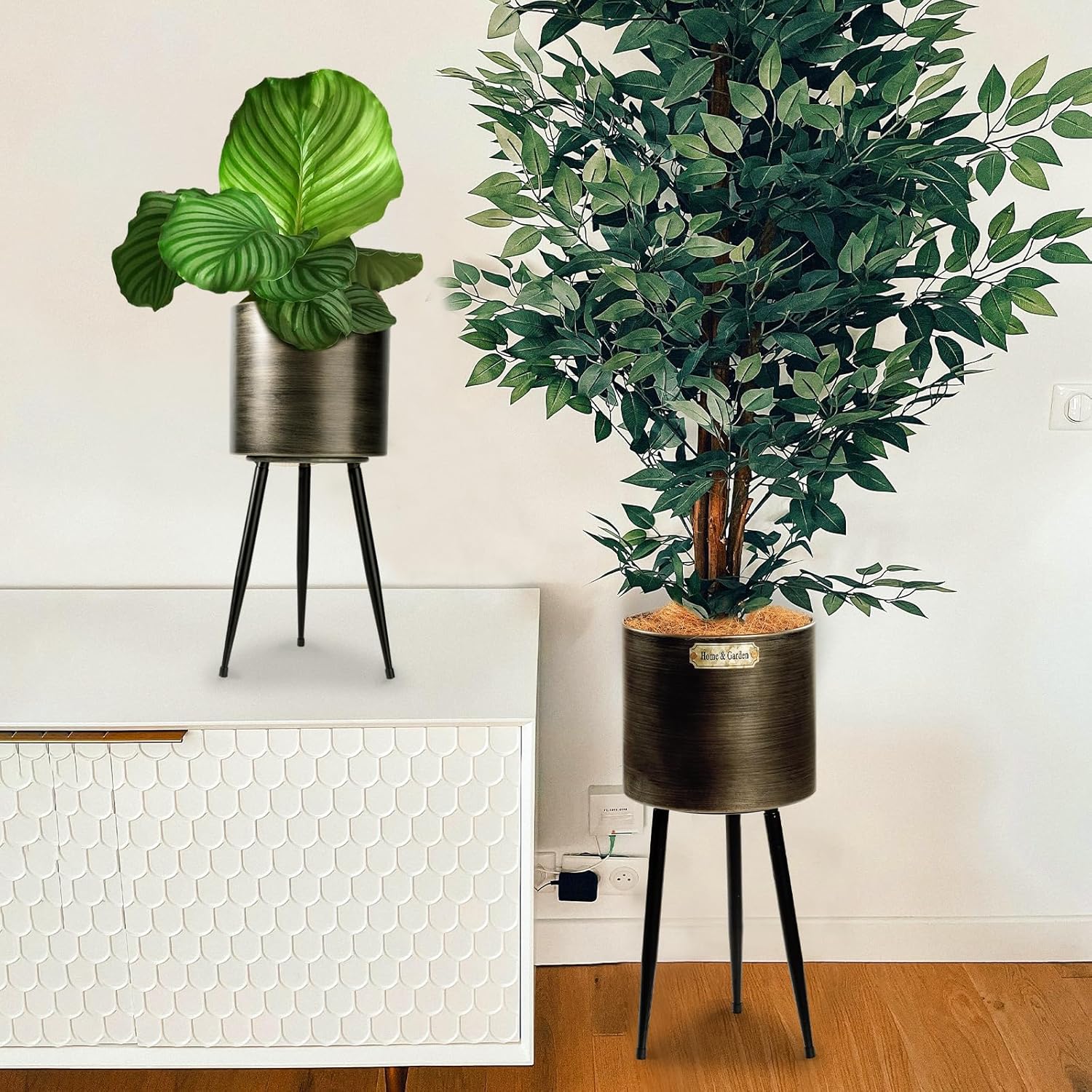 Harvest Land Plant Pots with Stand, Set of 2 Large Modern Planters Metal Tall Handmade Flower Pots with Drainage Holes Indoor Outdoor,Black