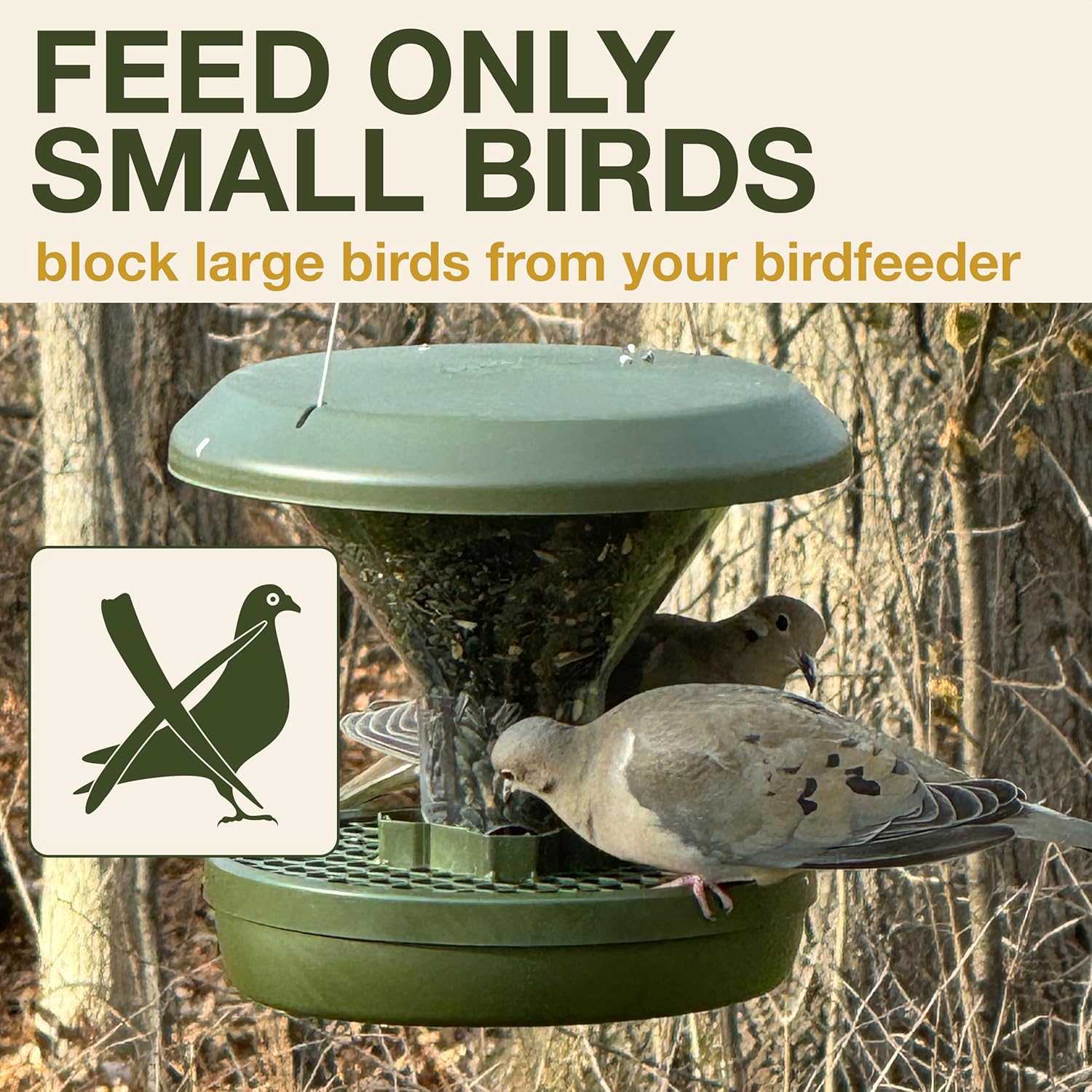 - Prevents larger unwanted birds like pigeons and crows that do not need to use a feeder.