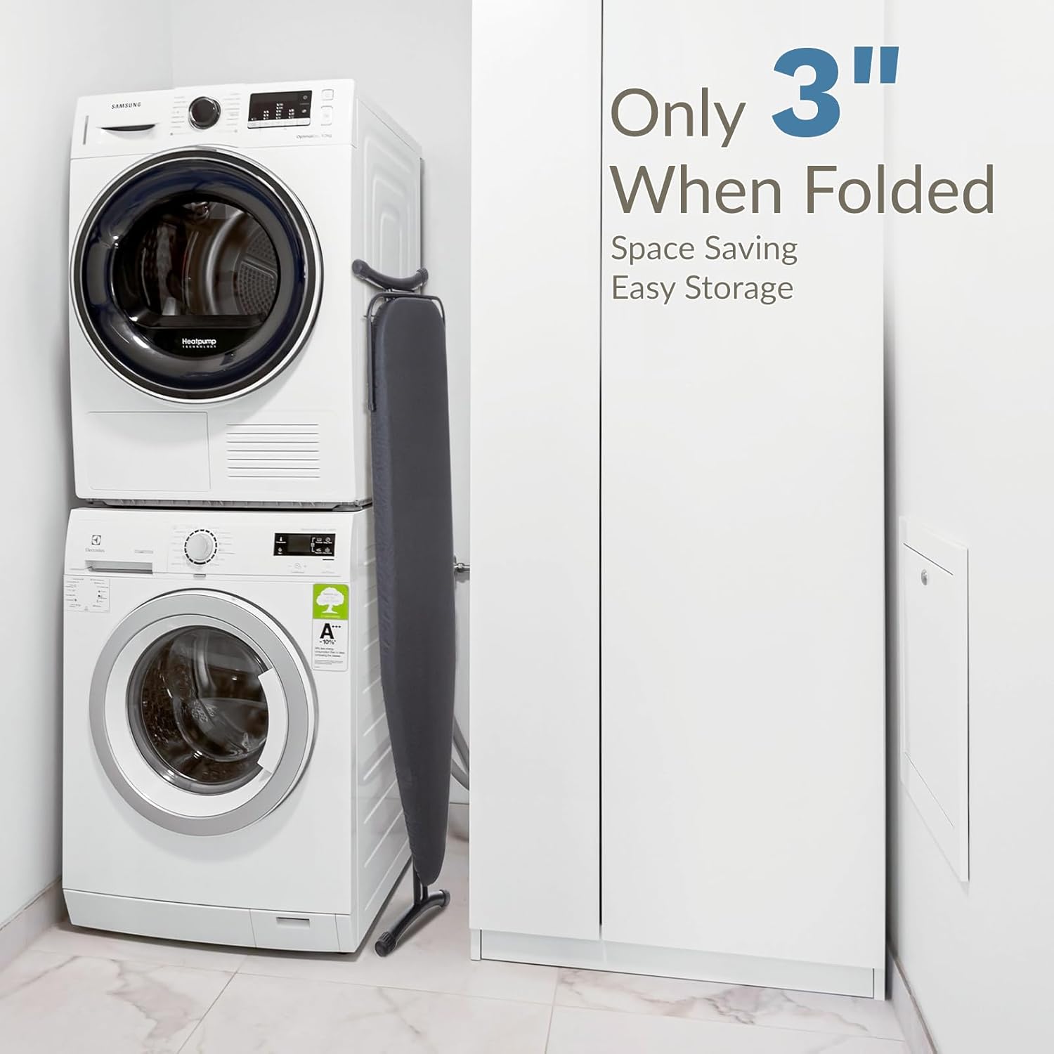 - Foldable and Compact: This ironing board easily folds up for convenient storage in tight spaces or behind doors, optimizing your living area. 55.75" L x 15.25" W x (27"-35")H when open, 54.25" L x 15.25" W x 3 " H when folded.