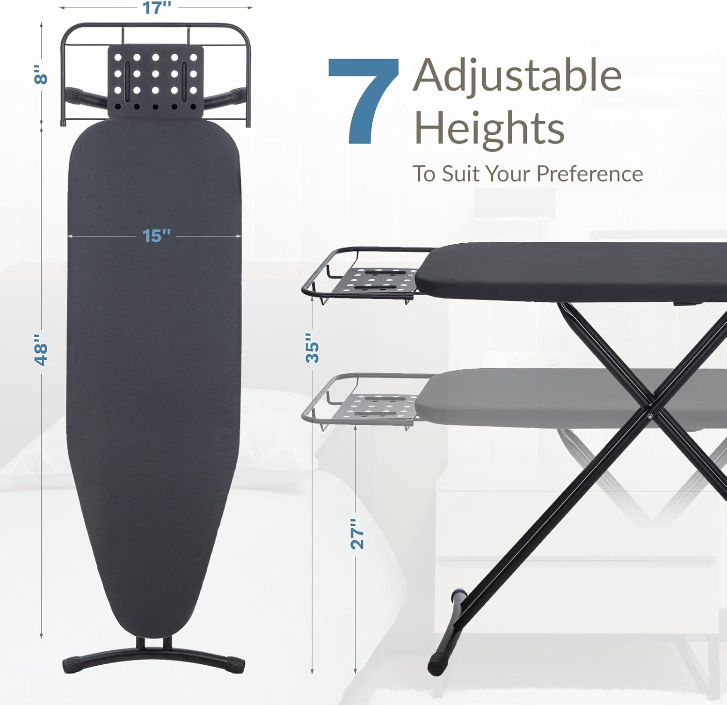 - Ironing Board Full Size: Our 48 "x15" standard size ironing board is perfect for home use, with 7-level height adjustments to accommodate users of all sizes, and stable, durable construction to make your ironing experience more comfortable.