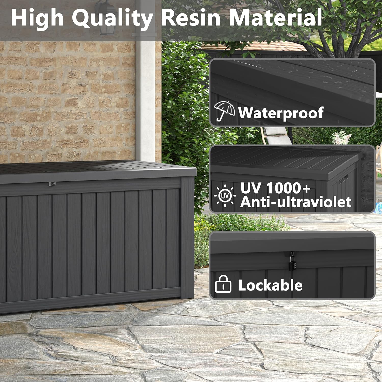- ALL WEATHER RESISTANT - Weatherproof resin makes this outdoor storage box waterproof, rustproof, corrosion resistant and extremely low maintenance; its wood grain complements any dรฉcor; NOTE: The colour of the storage box may vary in different scenarios, with darker colours indoors and lighter colours outdoors; to avoid accidents, please remember to remove all stored items before moving the storage box!