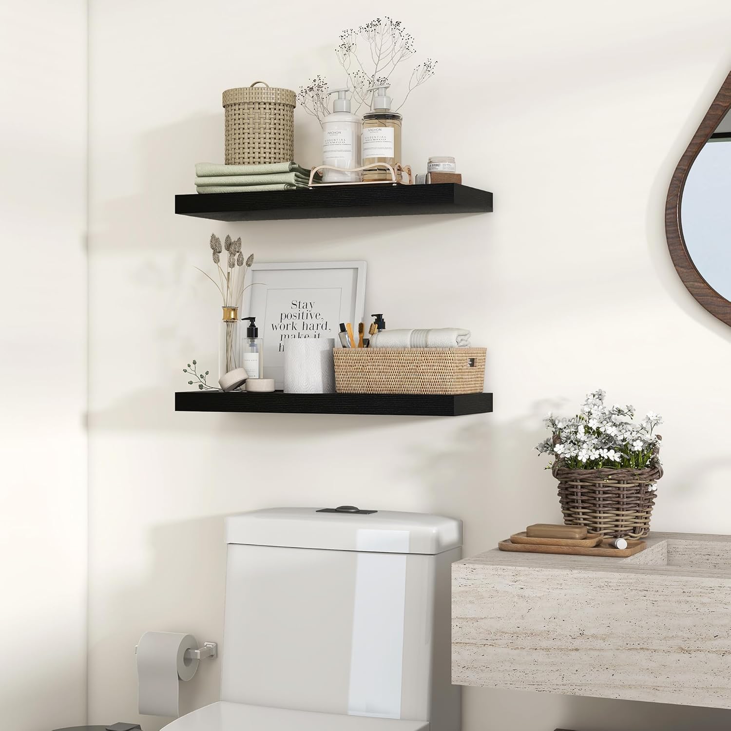 - 【Versatile】Our floating shelves are available in multiple different colors, so our invisible wall-mounted floating shelves are suitable for a variety of home environments, including bathrooms, living rooms, bedrooms, study rooms, and kitchens. It can be used as a storage space for small items and decorations in the bedroom, adding a touch of simplicity and warmth to the space.