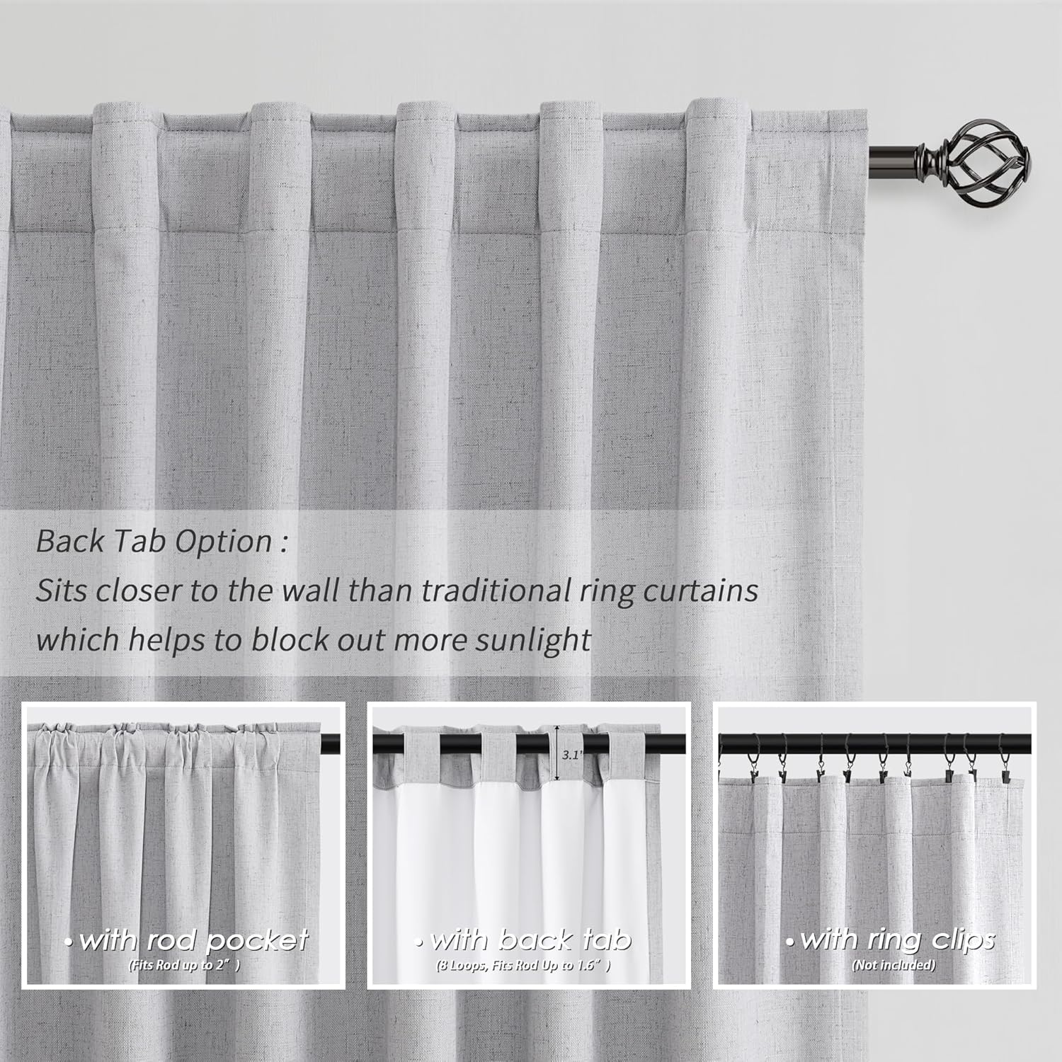 - 3 Hanging Options: Differ from the traditional curtains with grommet, BOODII linen curtains with back tab and rod pocket can full block sunlight fully. (1) Using the back tabs design to create an elegant pleated look and sit closer to the wall than traditional ring curtains, which helps to block out more sunlight; (2) Using rod pocket for a classic effect; (3) Using clip rings on track system or curtain rod, slide open/closed easily (clip rings are not included).