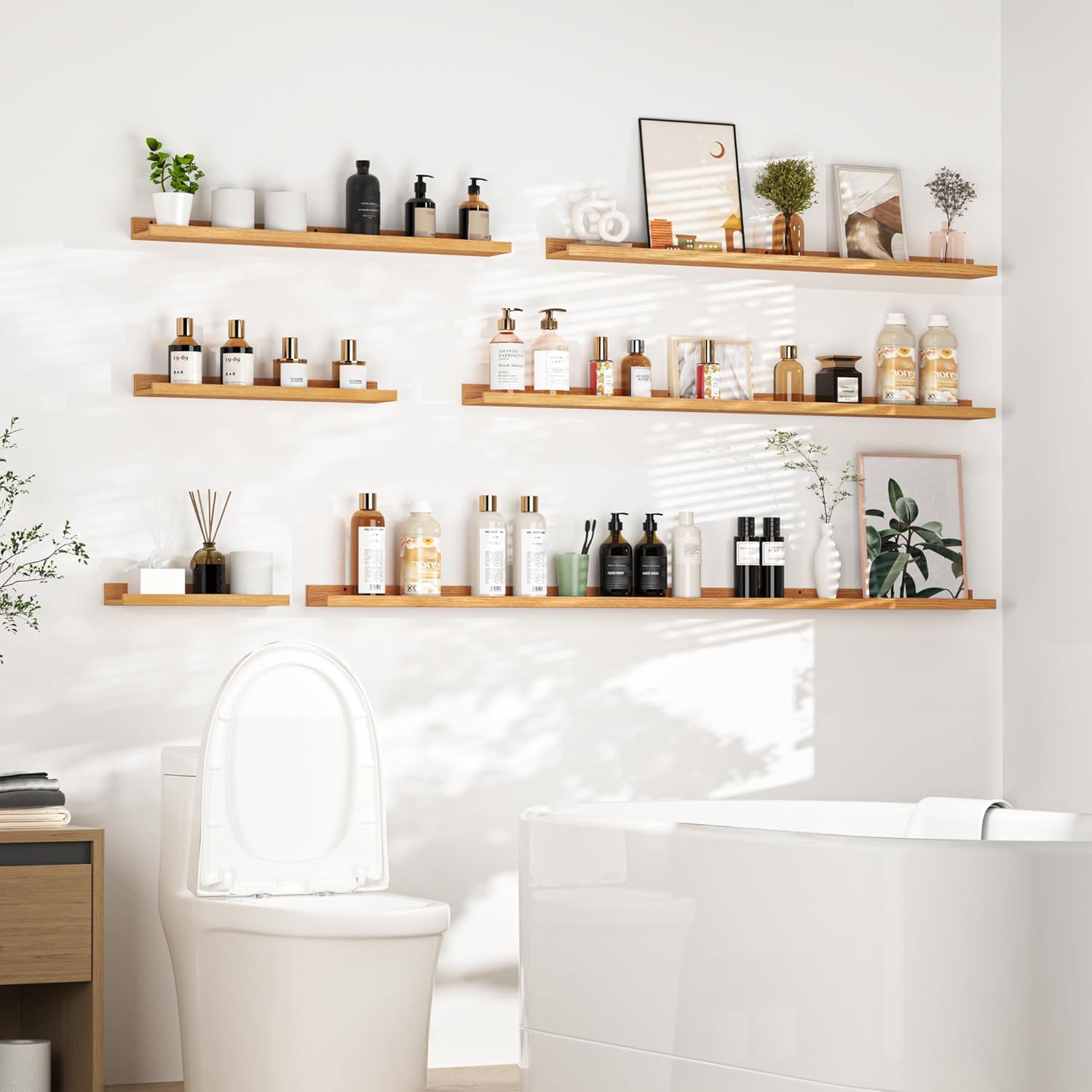 - Picture ledge Shelf for Walls: If you have dozens of pictures but don't know how to display them, Heimlove picture ledge shelves(especially large size) for walls are perfect! With our hanging shelves, store and display different types and sizes of photo frames in one place. The ledge in front of the wall shelves could prevent your precious items from falling off.