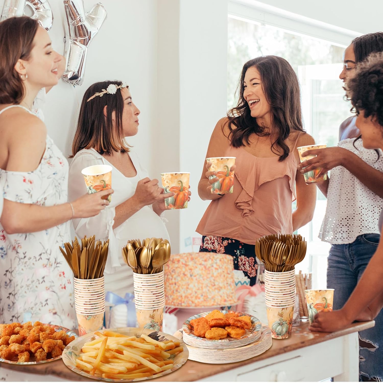 - Enticing Pumpkin Design: our disposable tableware set features stunning designs with vibrant pumpkins; These artistic and elegant designs will lend a decorative touch to the party setting; Watch as our tableware transform ordinary setups into remarkable dining experiences; Your guests will be delighted by our plates' subtle, yet striking aesthetic appeal