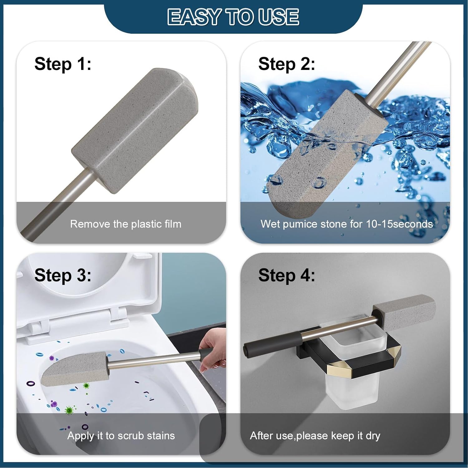 - Stainless Steel and Soft Grip Handle:The pumice stone toilet bowl cleaner is made of stainless steel handle that is stronger than traditional plastic toilet brushes,Meanwhile,the soft plastic sponge handle gives you a comfortable feeling and just perfect size for you hold when using