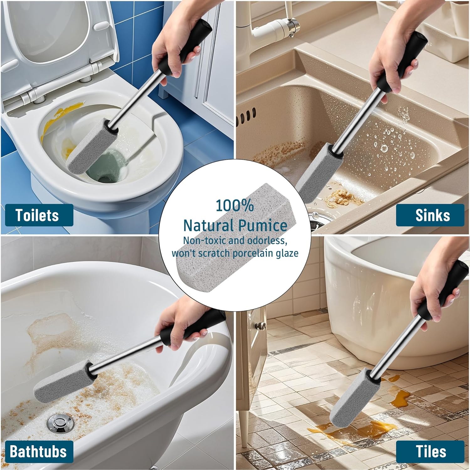 - Versatile Cleaning Tool:This extra long handle pumice stone powerfully cleans stain and hard water rings.Our pumice stone not only great for toilet bowls,also works on tiles,bbq grill,bath tubs and ceramic surfaces
