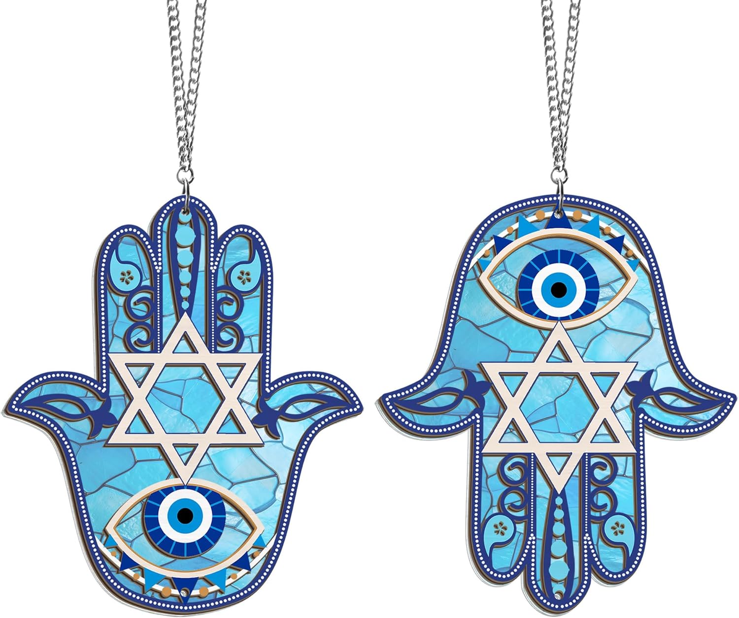- HANUKKAH GIFTS FOR WOMEN, MEN โ Celebrate the profound symbolism of the Hamsa protection amulet with our exquisite suncatchers for windows hanging. Adorned with the Star of David and Blue Evil Eye design, these house warming gifts for men, women, good luck gifts for mom, friends bring a serene touch of Hanukkah and Jewish spirit to your room, wall decor.