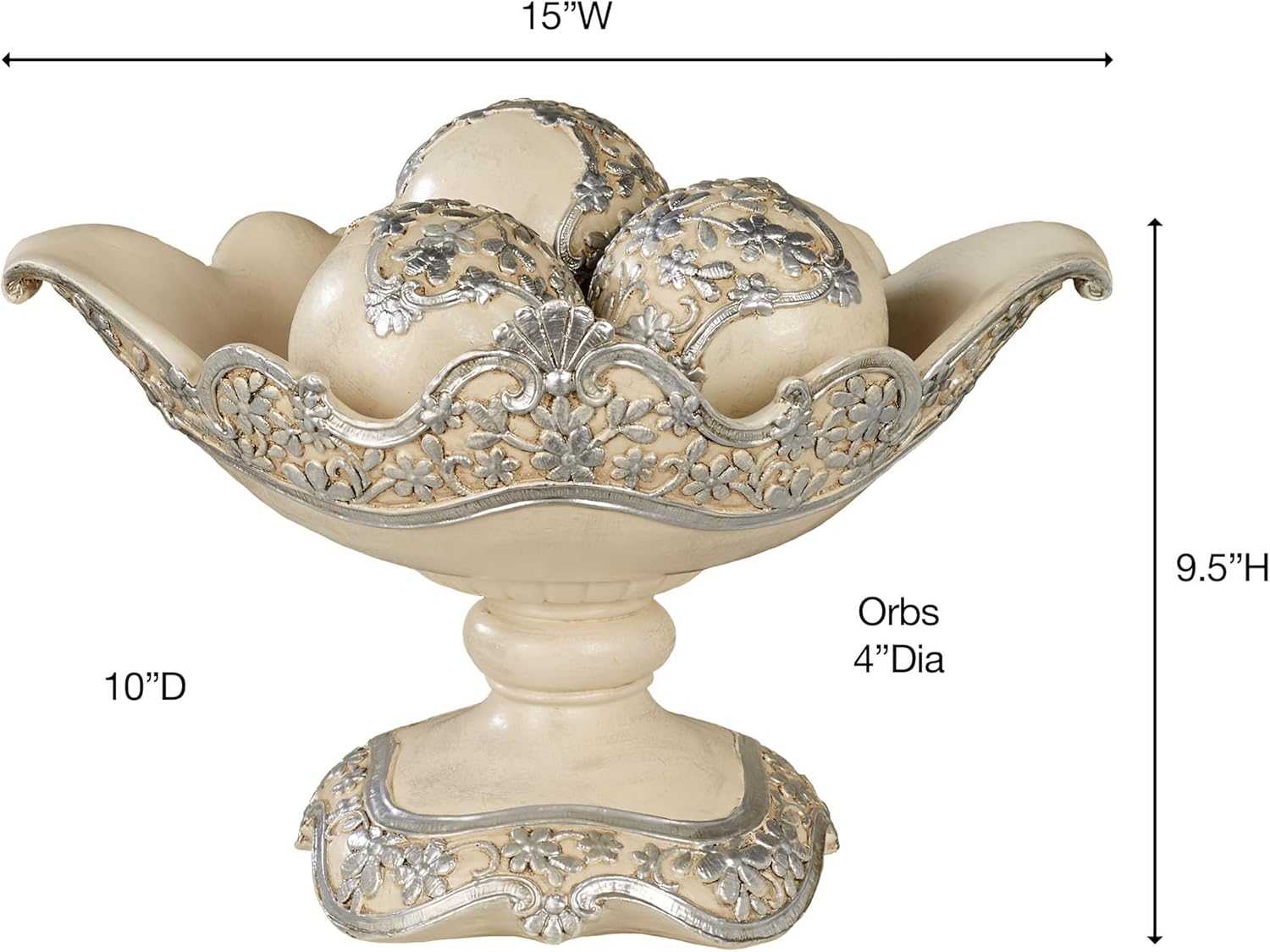 - DESIGN ELEMENTS: Centerpiece bowl with raised silver florals and scrolls. Handpainted resin accents have an ivory and silver background. Perfect as a centerpiece bowl orbs set for any elegant decor.