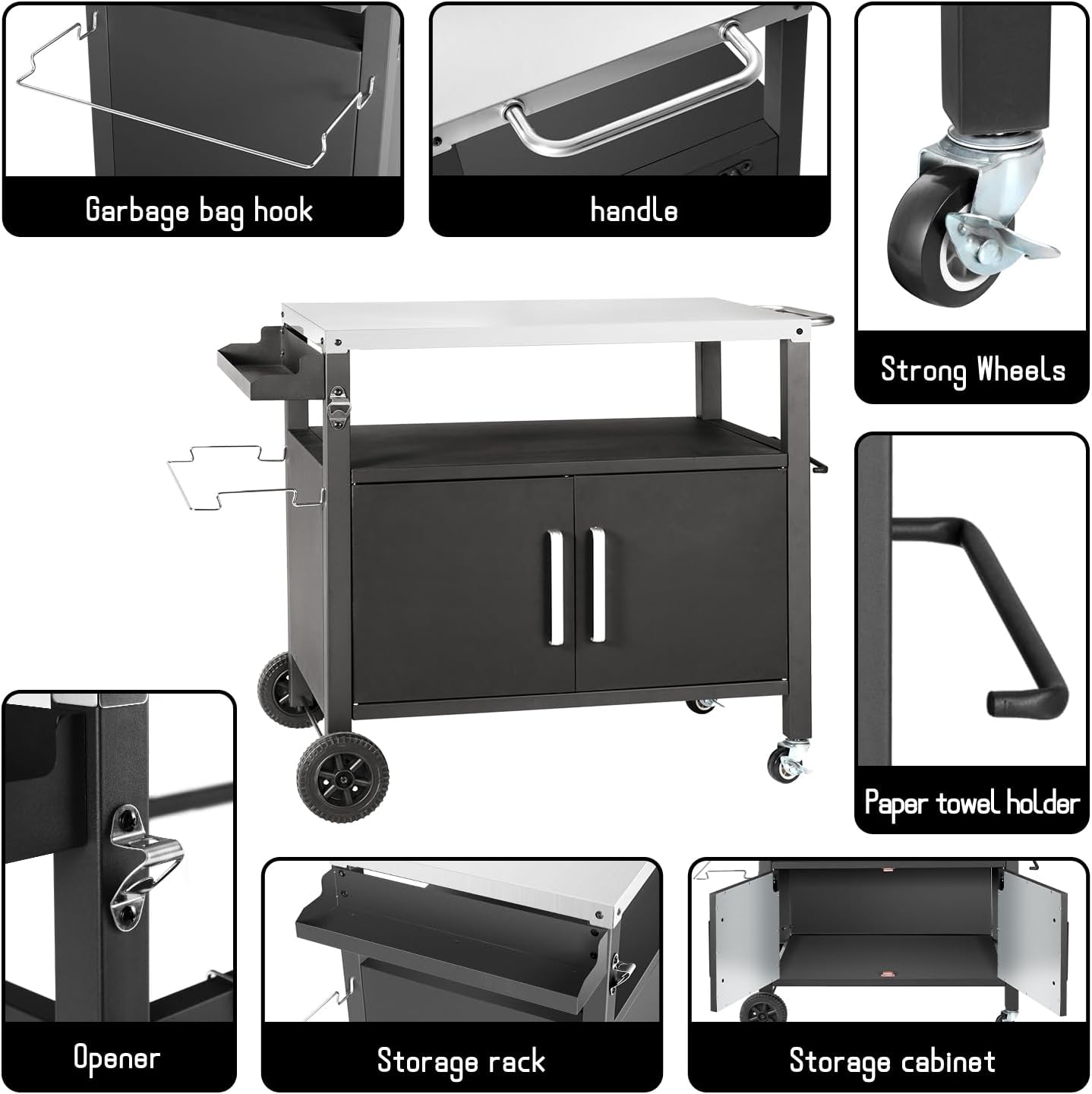 - 【Two Shelves and One Big Cabinet for Ample Storage】The grill table is designed with a practical dual shelf structure, giving you plenty of storage space for added convenience when organizing and transporting your items. The Top and bottom shelf weight capacity: 100 LBS, middle shelf weight capacity: 50 LBS.