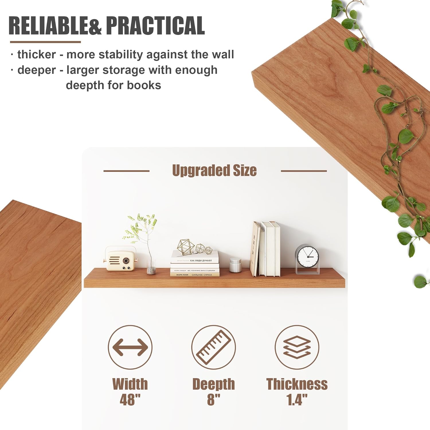Floating Shelves for Wall, USA-Sourced Cherry Wood 48 Inch Long Wall Shelves, Natural Wooden Wall Mounted Picture Ledge Shelf, Nursery Book Storage Shelf Kids Bookshelf, Display Shelf for Bathroom