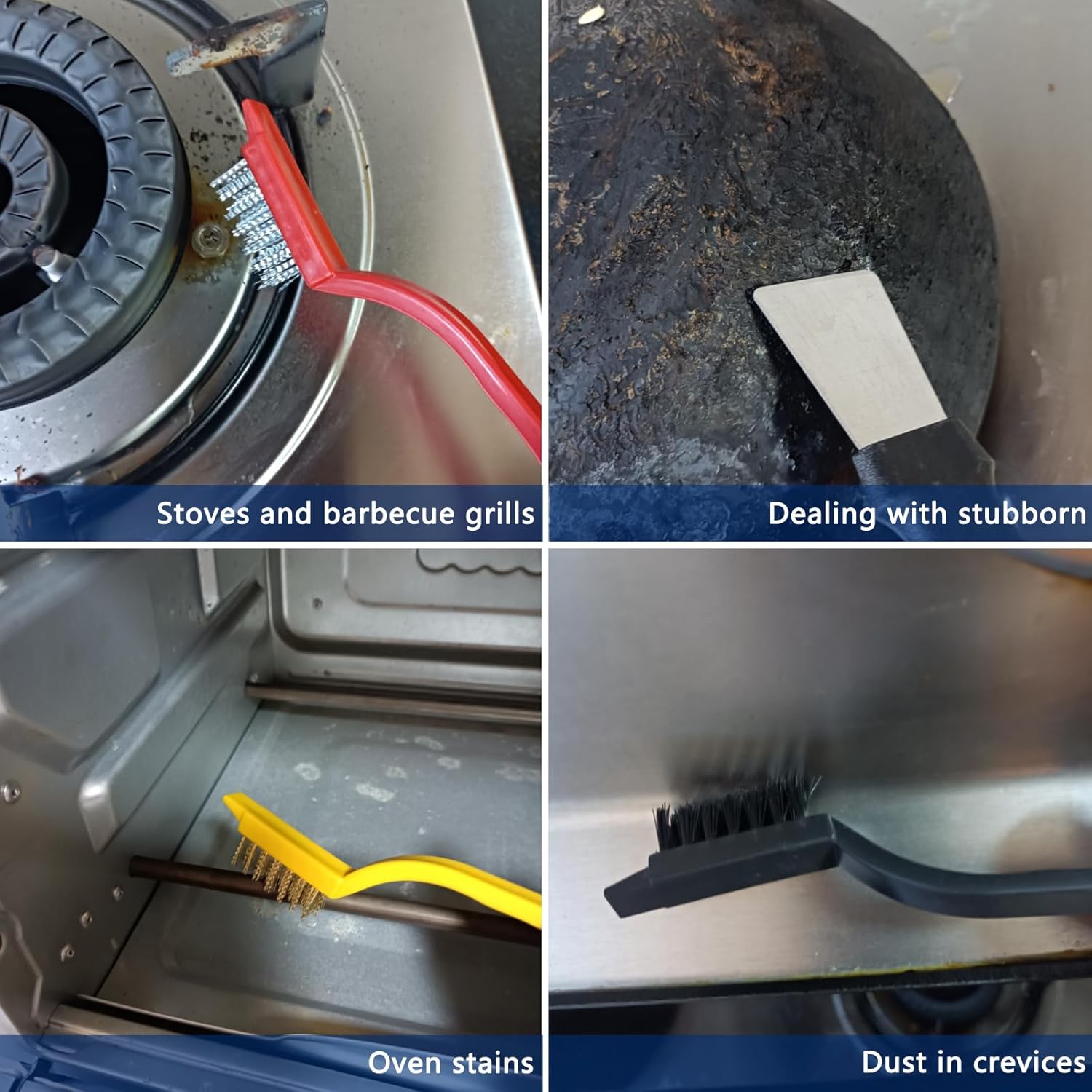 - Multi functional design: One end of the handheld gap cleaning brush is designed to remove loose dirt, and the other end is equipped with a scraper to solve stubborn dirt. The 2-in-1 function door and window cleaning brush can be folded and stored. One end is used for cleaning gaps, and the other end is used for collecting dust. The long handled white brush has a 90 ยฐ angle and small bristles, making it easy to reach narrow spaces and effectively helping you clean areas that are difficult to clean or stubborn stains. Three small wire brushes, with bristles made of brass, stainless steel, and nylon, used for cleaning to varying degrees; Scraper can handle various stubborn dirt