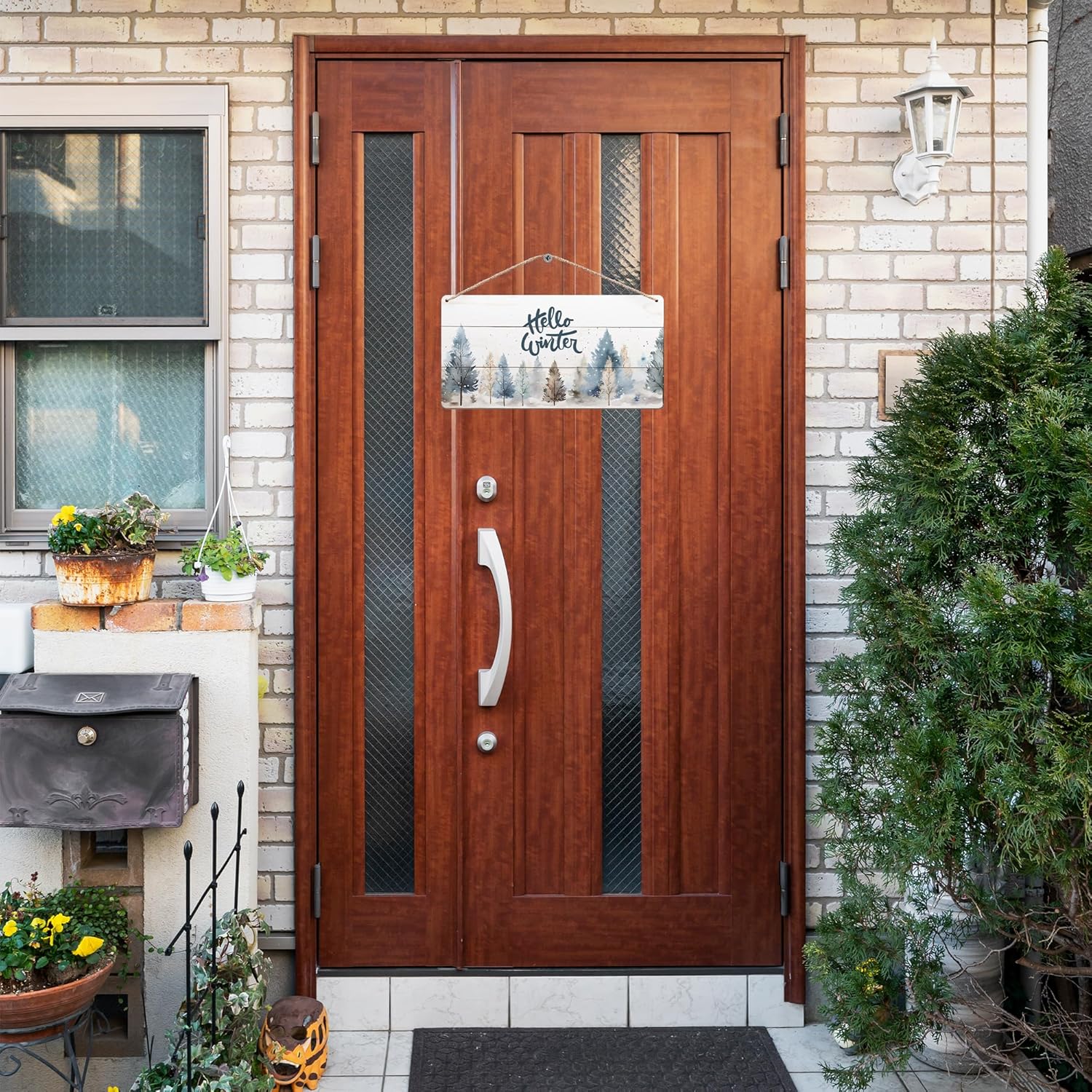 DUXMNAMG Hello Winter Welcome Hanging Wooden Signs 12x6, Pine Tree Decor, Winter Door Decorations, Winter Door Sign, Rustic Winter Christmas Snowflakes Trees Home Room Office Hanging Wall Decor