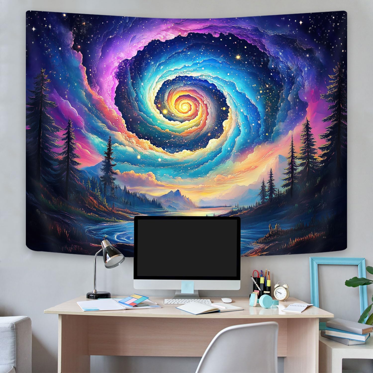 Galaxy Space Tapestry, Cool Colorful Trippy Forest Mountain River Aesthetic Tapestries, Psychedelic Starry Sky Swirls Misty Fantasy Landscape Tapestry Wall Hanging College Bedroom for Guys Men 80X60