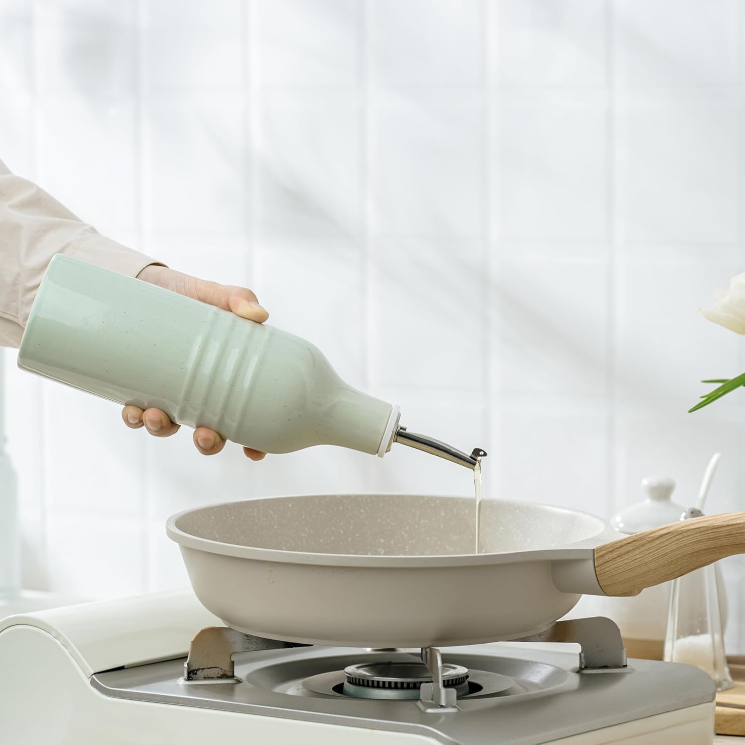 famiware Jupiter 16oz Ceramic Olive Oil Dispenser Bottle, Olive Oil and Vinegar Dispenser Bottle Set of 2 with Stainless Steel Pourers, Suitable for Storage Vinegar, Liquids, Light Green