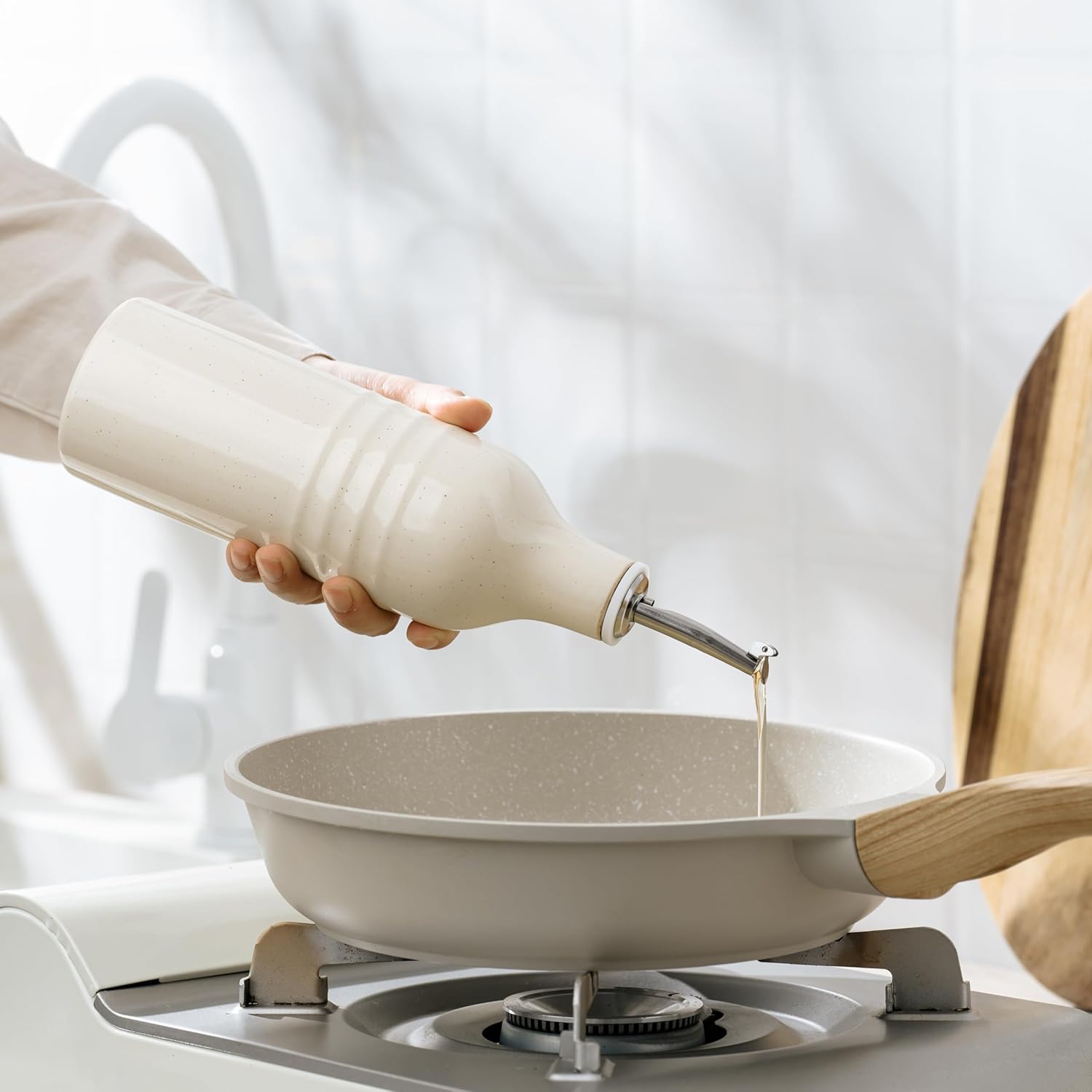 - KEEPS OIL FRESH - Exposure to light can cause olive oil to go rancid. This opaque olive oil dispenser bottle ceramic protects your olive oil or vinegar from harmful UV rays, keeping it fresh longer