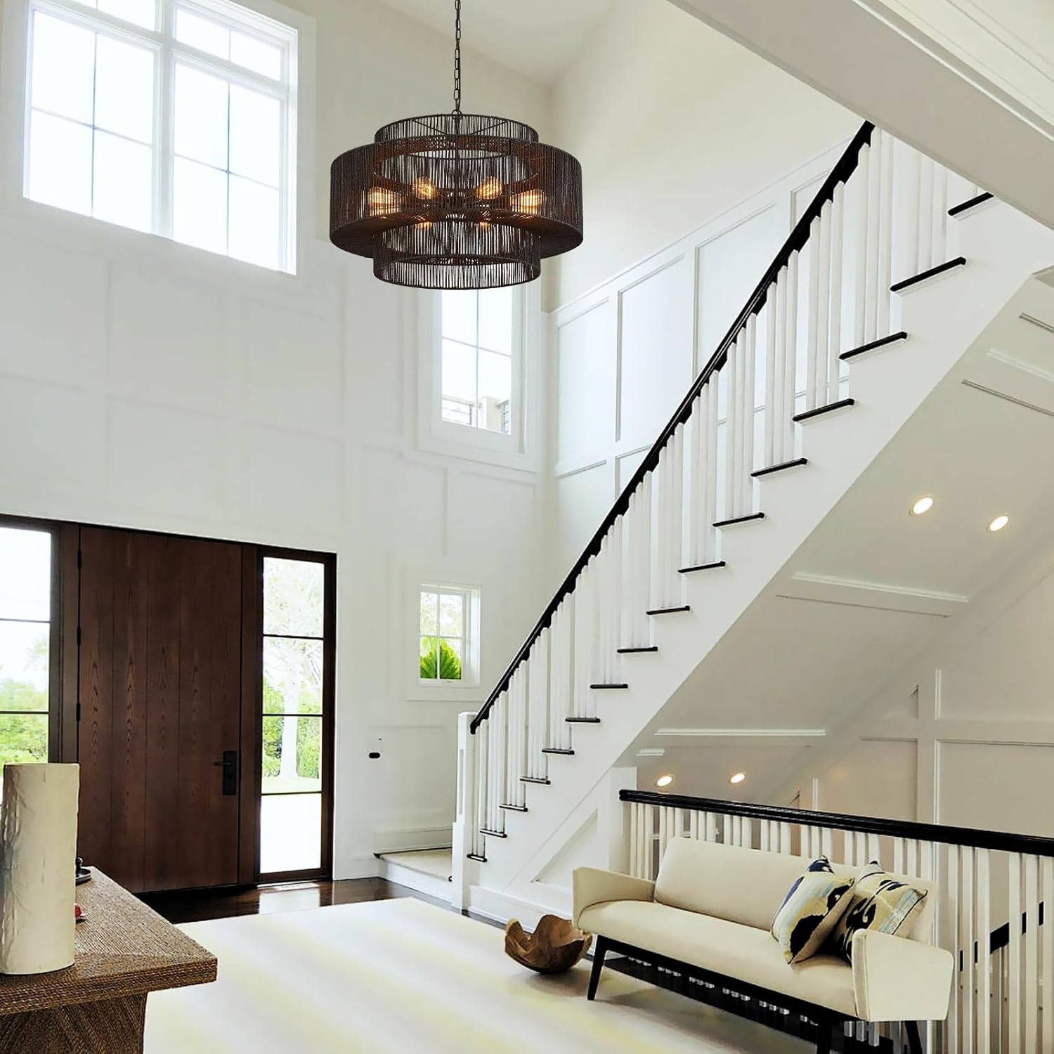 - 【3-Tier Design】The 3-tier rattan black chandelier's simple wicker weave and black finish metal frames bring a vintage bohemian style. This farmhouse chandelier light fixture features three round metal frames that form a captivating semicircular hollow cage. This design sets it apart, adding an element of sophistication.