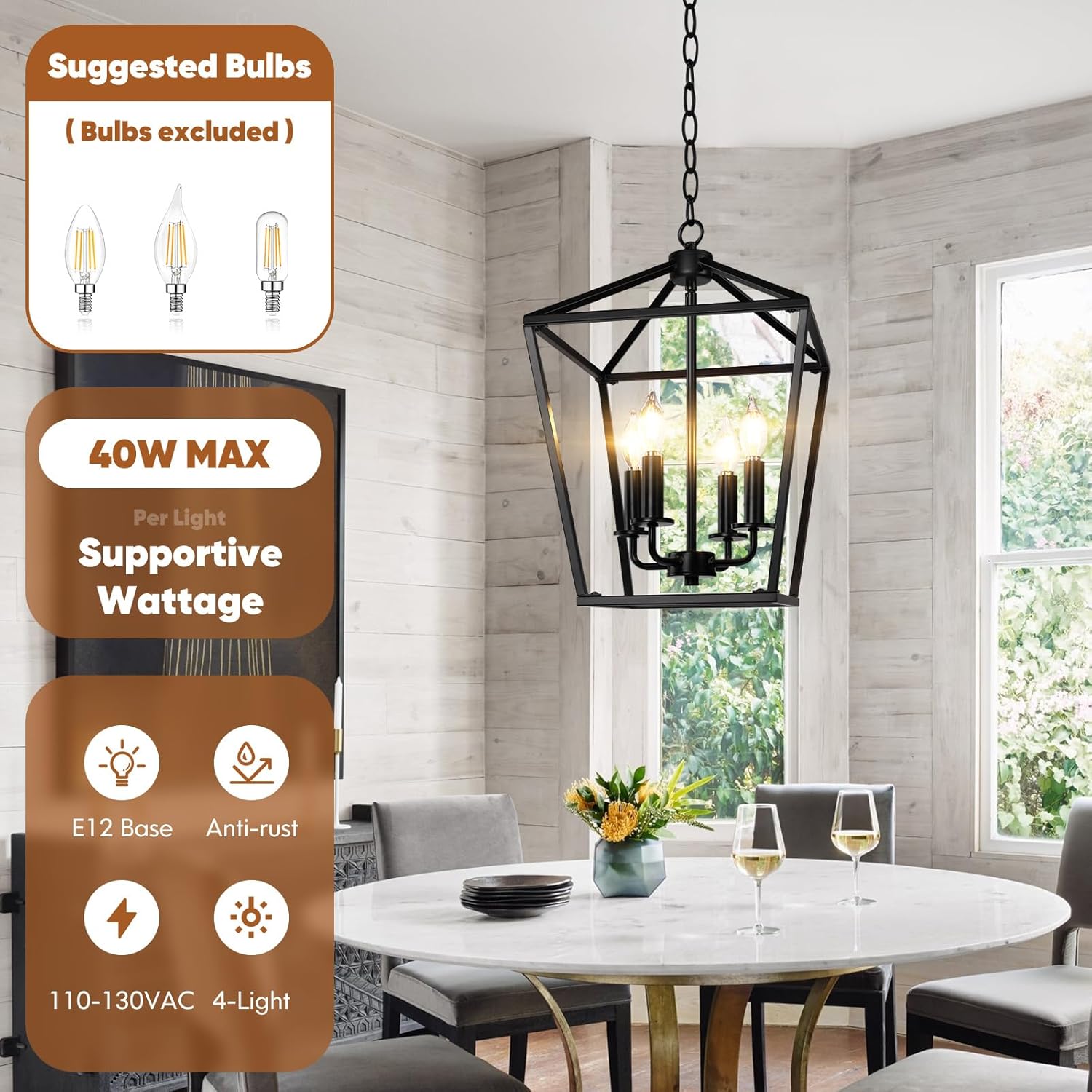 - ✔【Bulb Requirement】The farmhouse chandelier has 4 E12 base sockets and does not include light bulb. You can choose Edison bulbs as showed on images or other types you like to match it. Light bulbs with dimming capacity also work on this chandelier so you can easily change the mood of your space. The maximum bulb wattage is 40 Watt for each light.