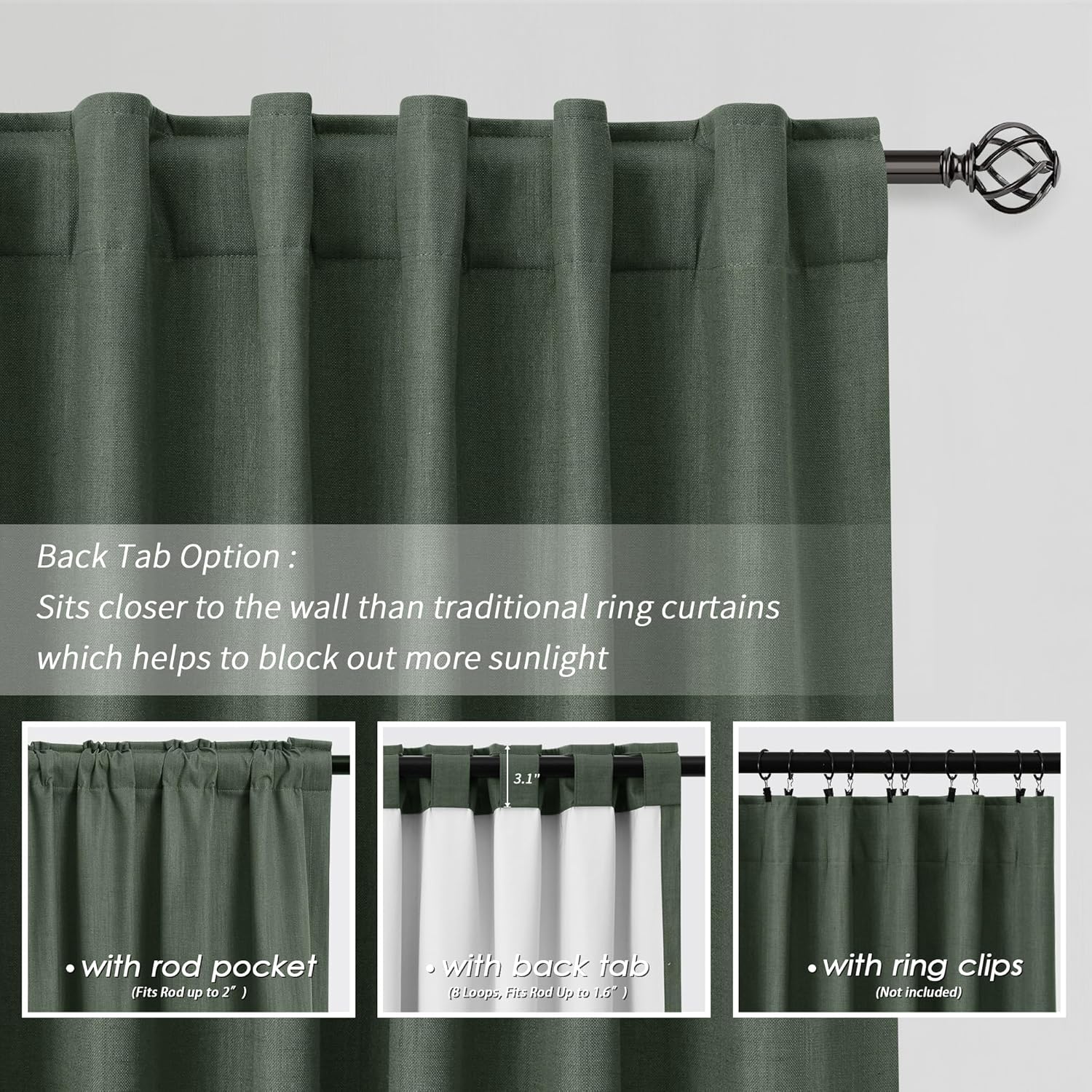 - 3 Hanging Options: Differ from the traditional curtains with grommet, BOODII linen curtains with back tab and rod pocket can full block sunlight fully. (1) Using the back tabs design to create an elegant pleated look and sit closer to the wall than traditional ring curtains, which helps to block out more sunlight; (2) Using rod pocket for a classic effect; (3) Using clip rings on track system or curtain rod, slide open/closed easily (clip rings are not included).