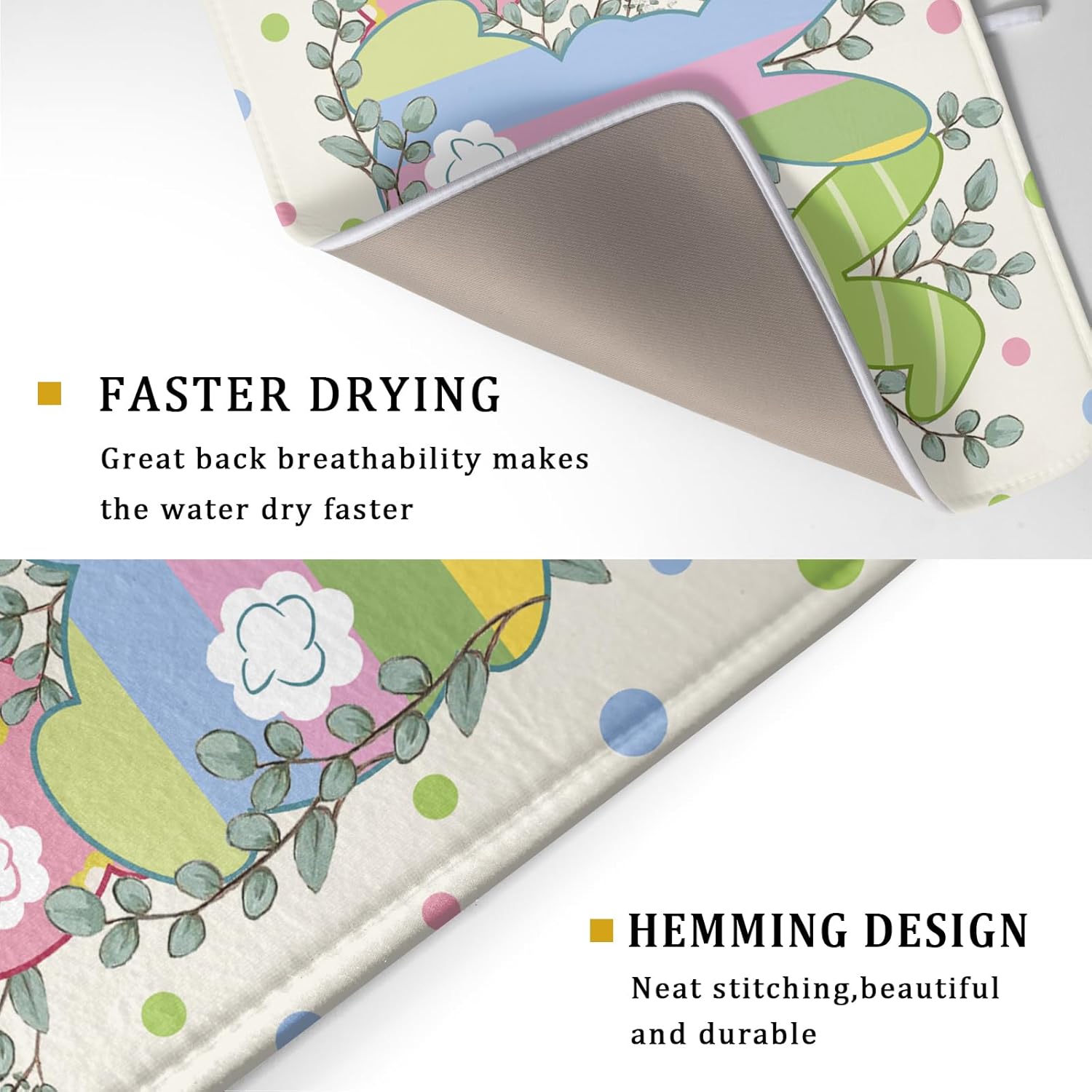 - 【Absorbent】The Easter dish drying mat is a 3-ply design made of absorbent microfiber, composite sponge, and cotton sateen fabric, the dish drying pad absorbs 4X its weight in water. Perfect for air-drying dishes, glasses, pots, pans, bottles, fruits, and vegetables