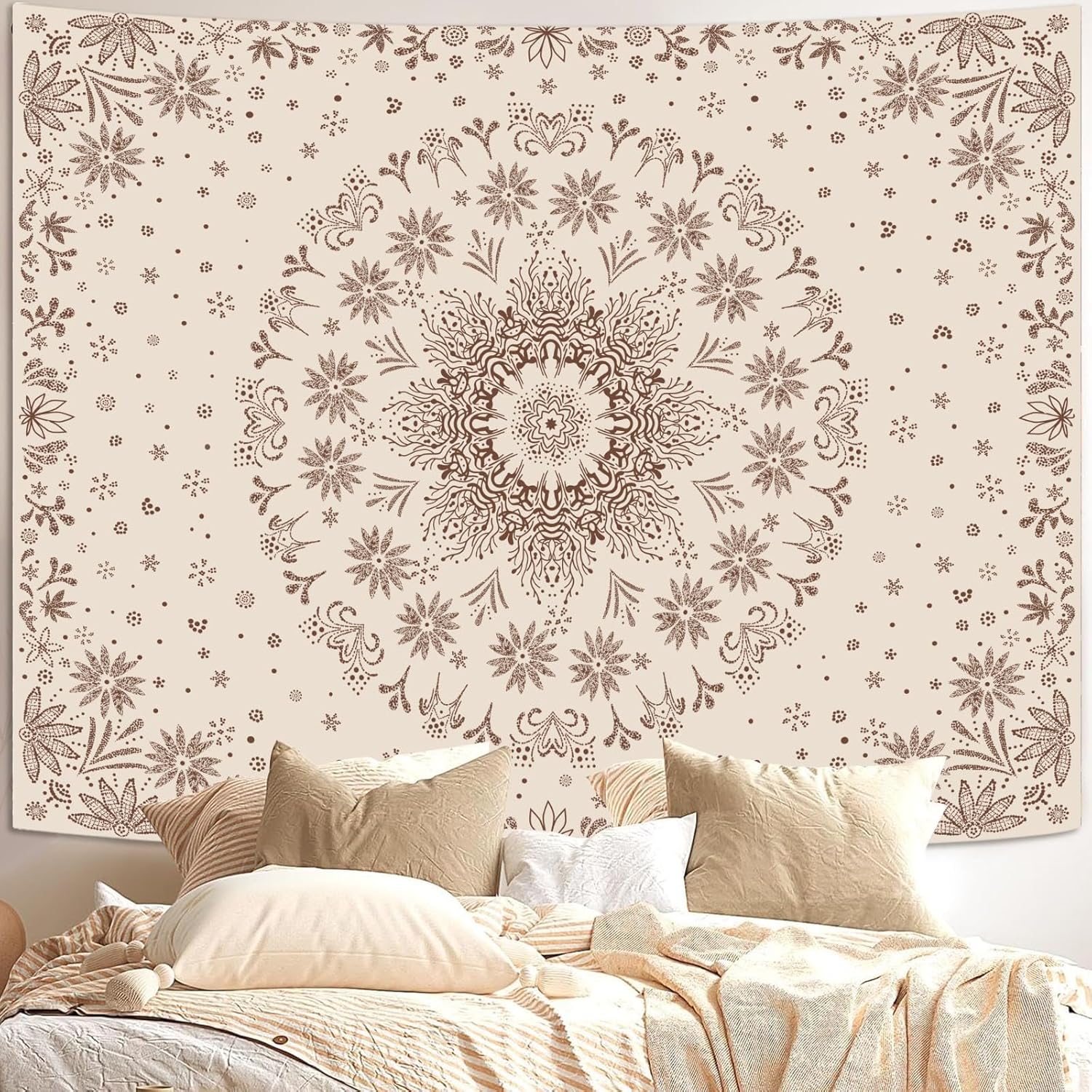 Fowocu Boho Floral Mandala Tapestry Wall Hanging Bohemian Flower Medallion Tapestry Aesthetic Beige Brown Hippie Indian Small Tapestries for Bedroom Living Room Dorm Decor 90 x 68 Inch