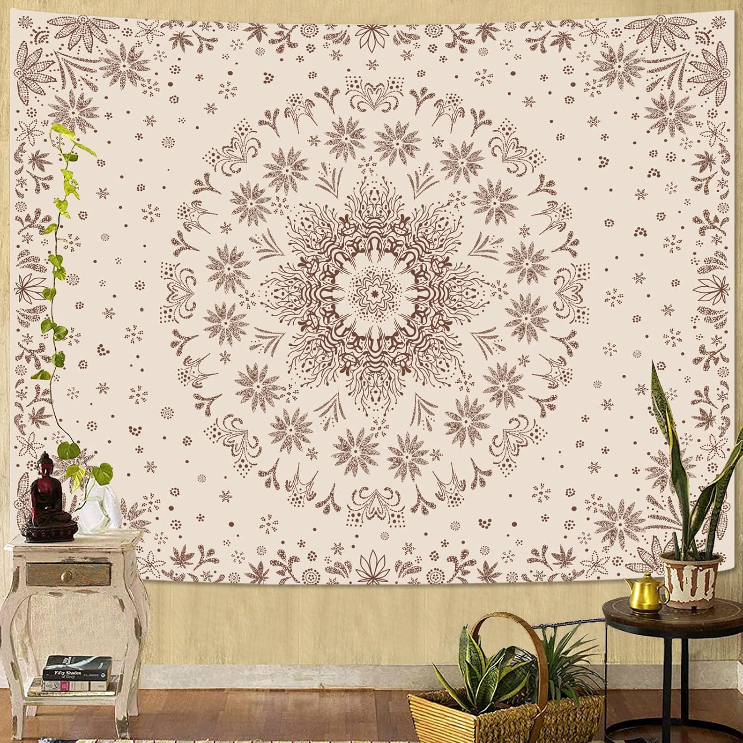 Fowocu Boho Floral Mandala Tapestry Wall Hanging Bohemian Flower Medallion Tapestry Aesthetic Beige Brown Hippie Indian Small Tapestries for Bedroom Living Room Dorm Decor 60 x 44 Inch