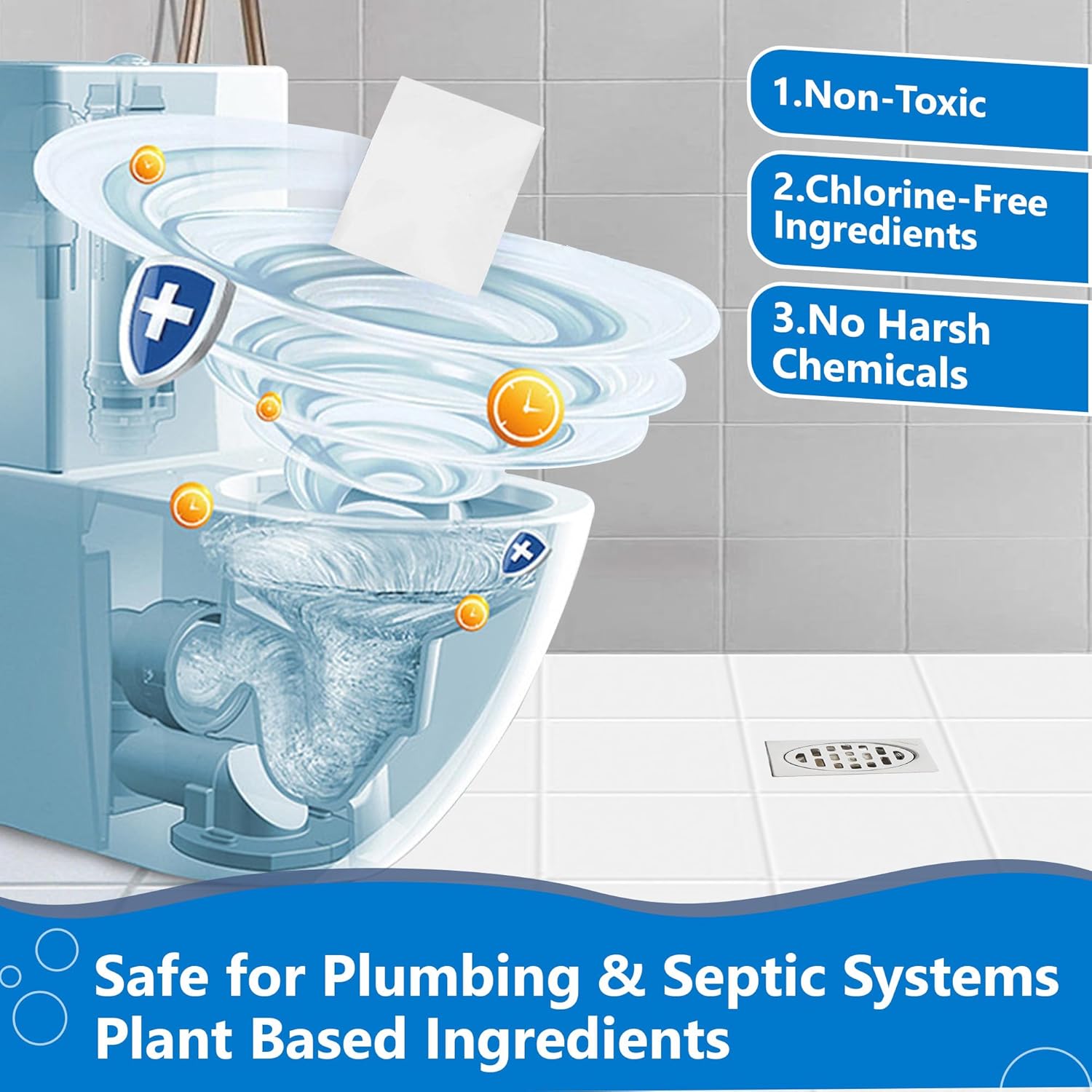 - Safe for Plumbing & Septic Systems: Made with neutral ingredients, these toilet bowl cleaner sheets are safe for both your skin and your toilet's internal components, plumbing, and septic system. Enjoy a worry-free cleaning experience with no risk of damage