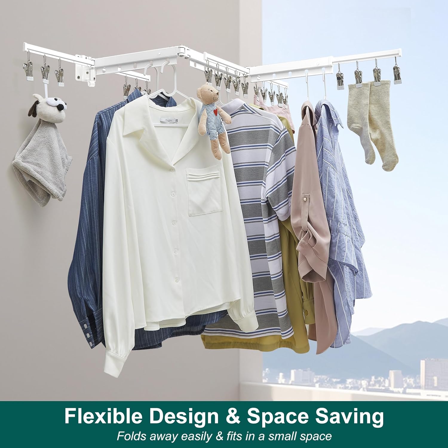 - 360ยฐ Rotating Tri-Fold: Tri-fold design for excellent space utilization. When not in use, you can retract the wall-mounted drying rack against the wall to save space. An ideal solution for any living room or laundry room to save space.