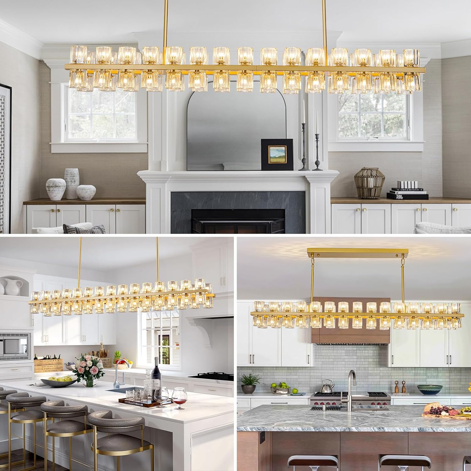 Crystal Brass Rectangle Chandeliers for Dining Room, 54in Gold Farmhouse Chandeliers for Dining Room, Modern Rectangle Crystal Chandelier for Kitchen Island Living Room, Includes 60XG4 Bulbs